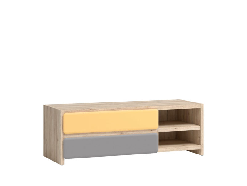 z popielatym jest obecnie hitem wnętrzarskiej mody! Szafka pod telewizor z gołębimi i cytrynowymi frontami to designerskie strzały w dziesiątkę!