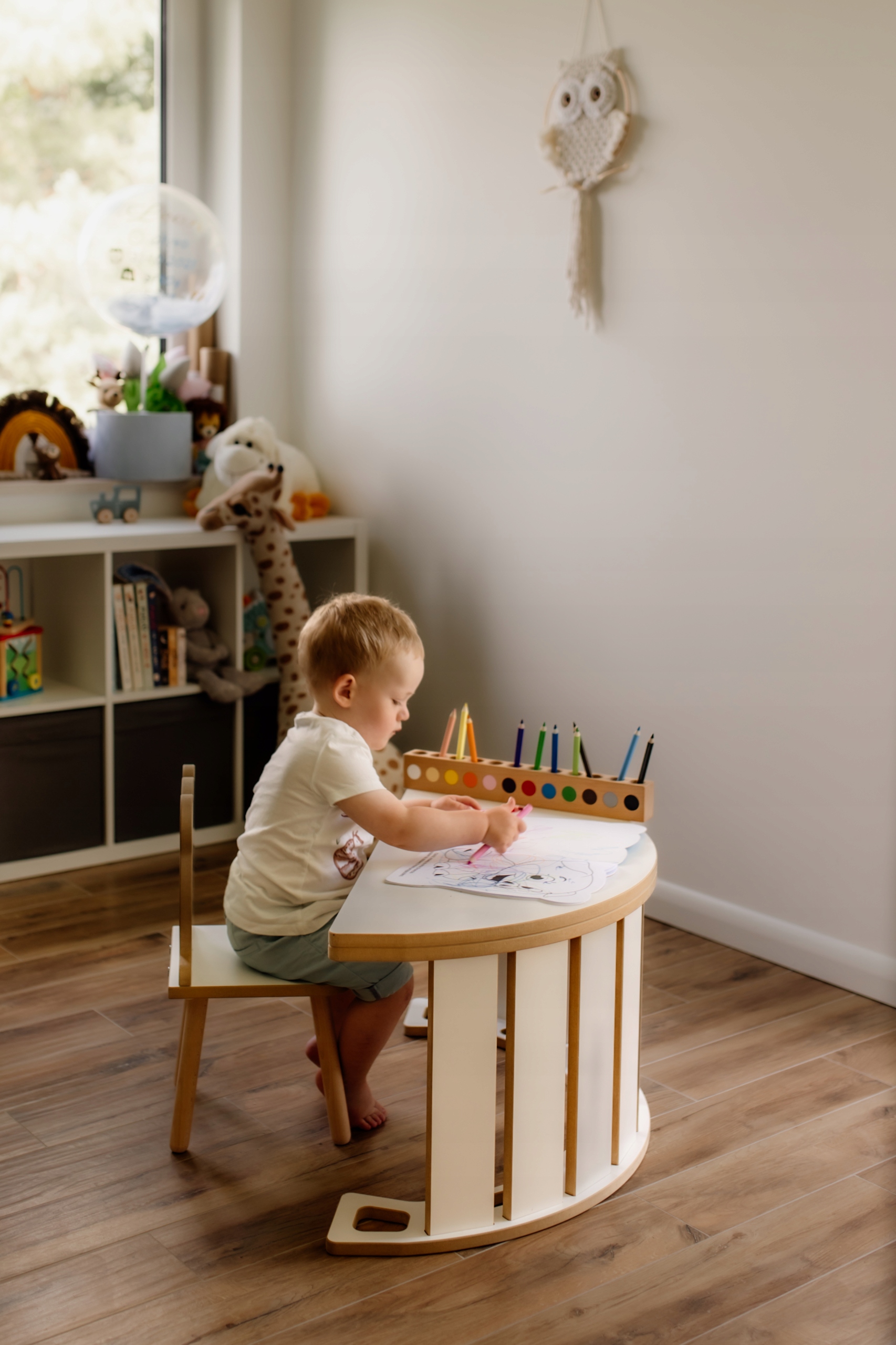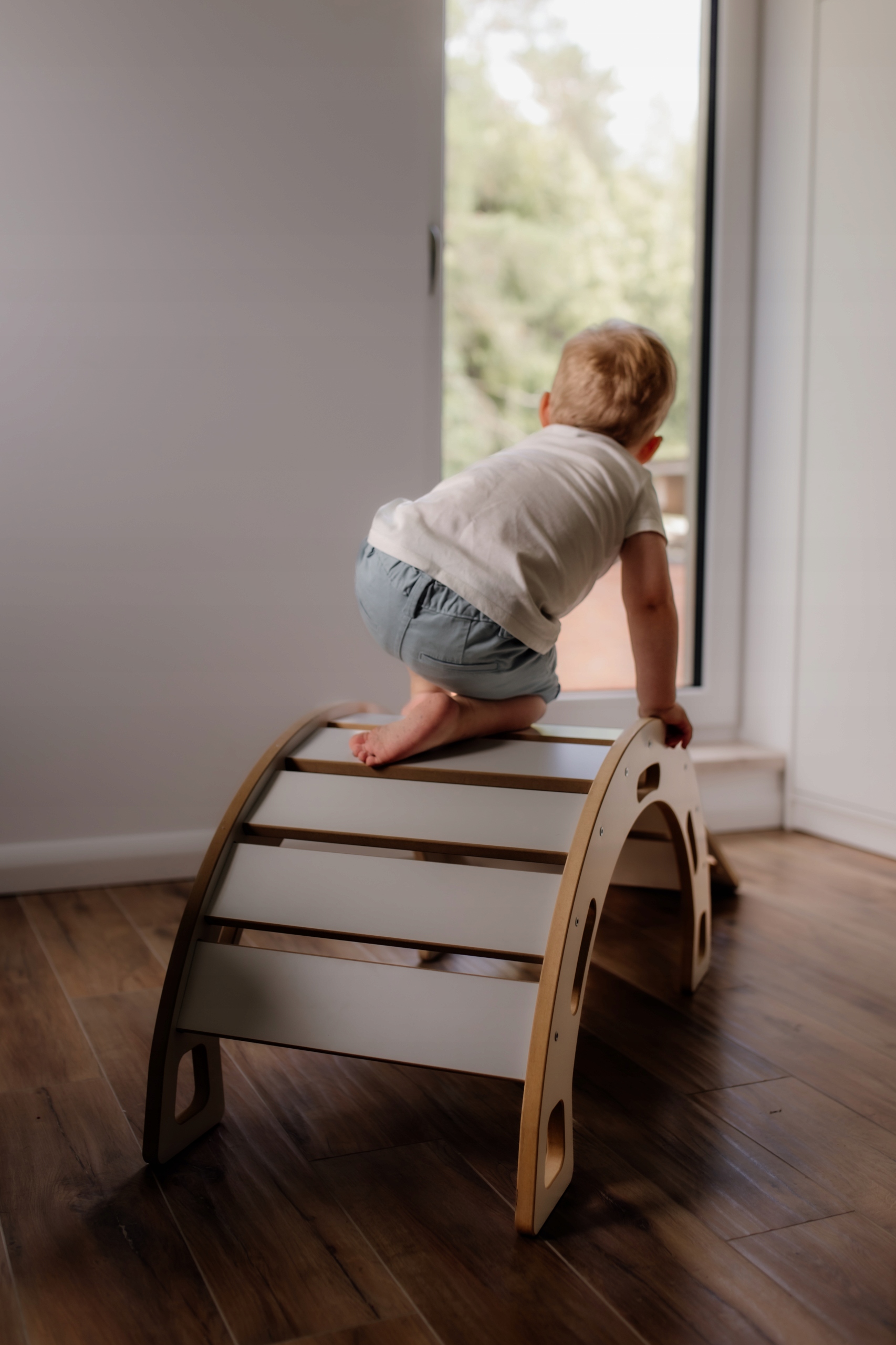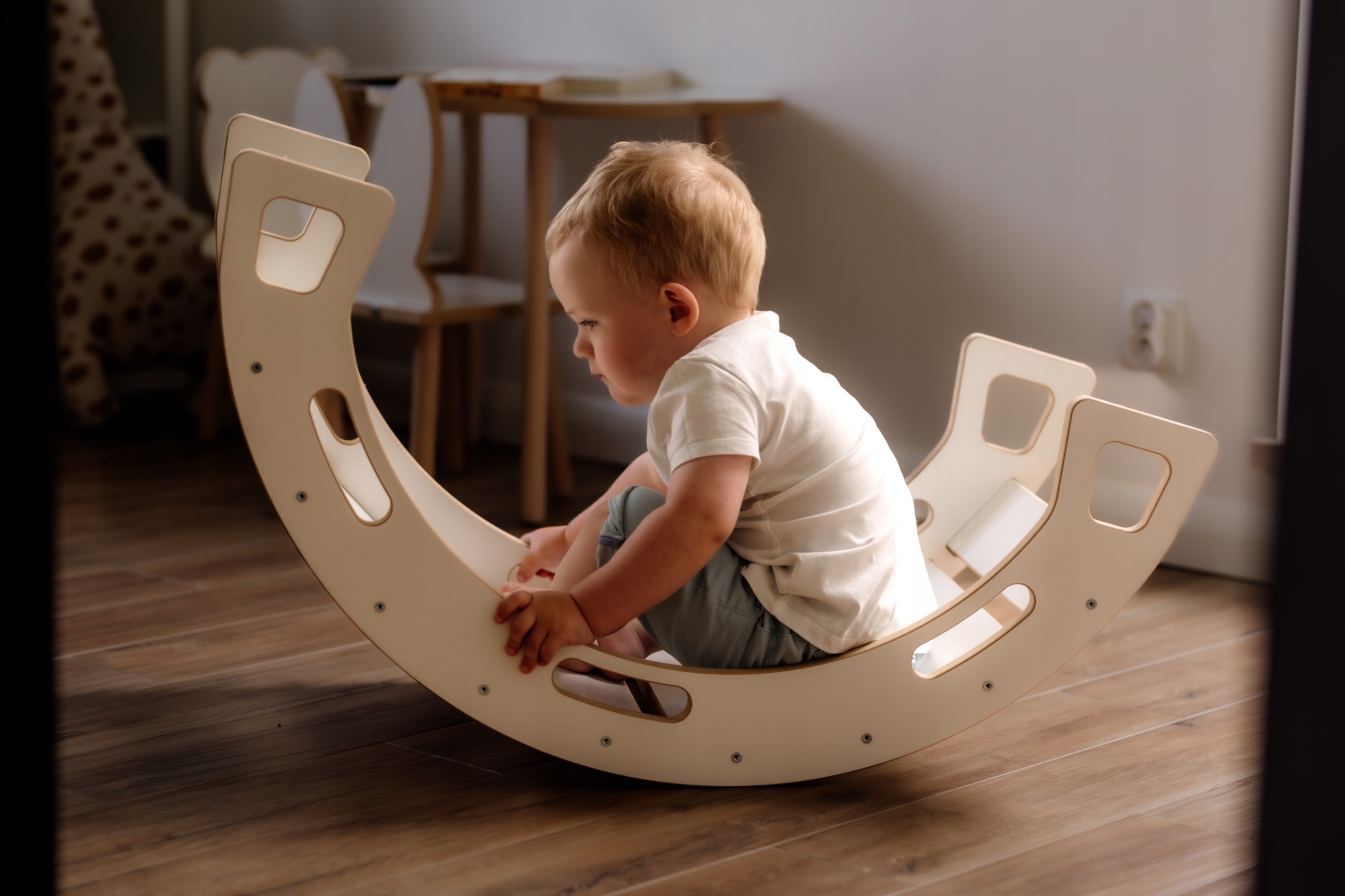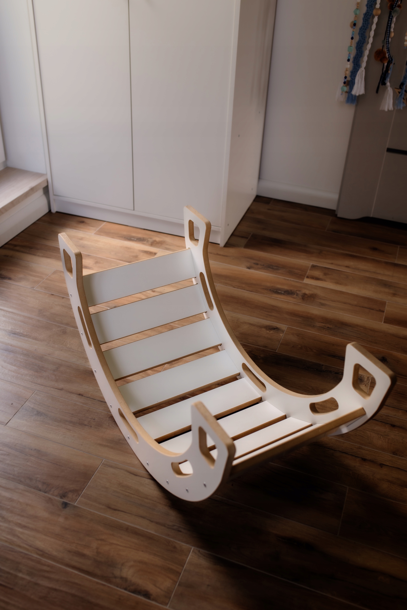 Wykonany z solidnych materiałów (grubej 18 mm płyty MDF), bujak zapewnia stabilność i bezpieczeństwo podczas użytkowania. Jego prosty, ale elegancki design w kolorze białym pasuje do każdego wnętrza, dodając mu wyjątkowego uroku. Zastosowanie trwałego materiału gwarantuje długotrwałe użytkowanie i niezawodność.