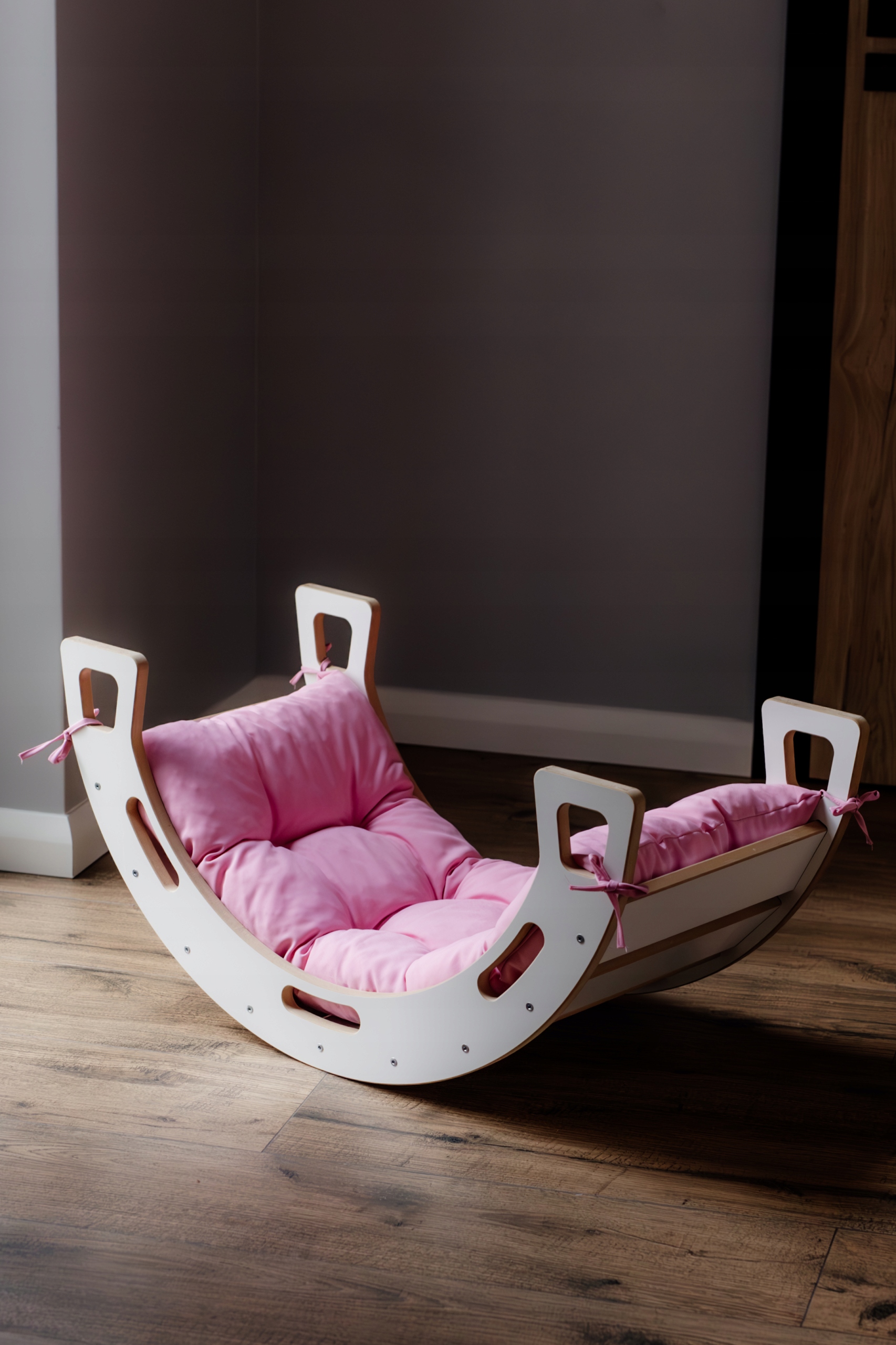 Mega zestaw: Biały bujak dla dziecka + różowa poduszka + zjeżdżalnia ze ścianką wspinaczkową