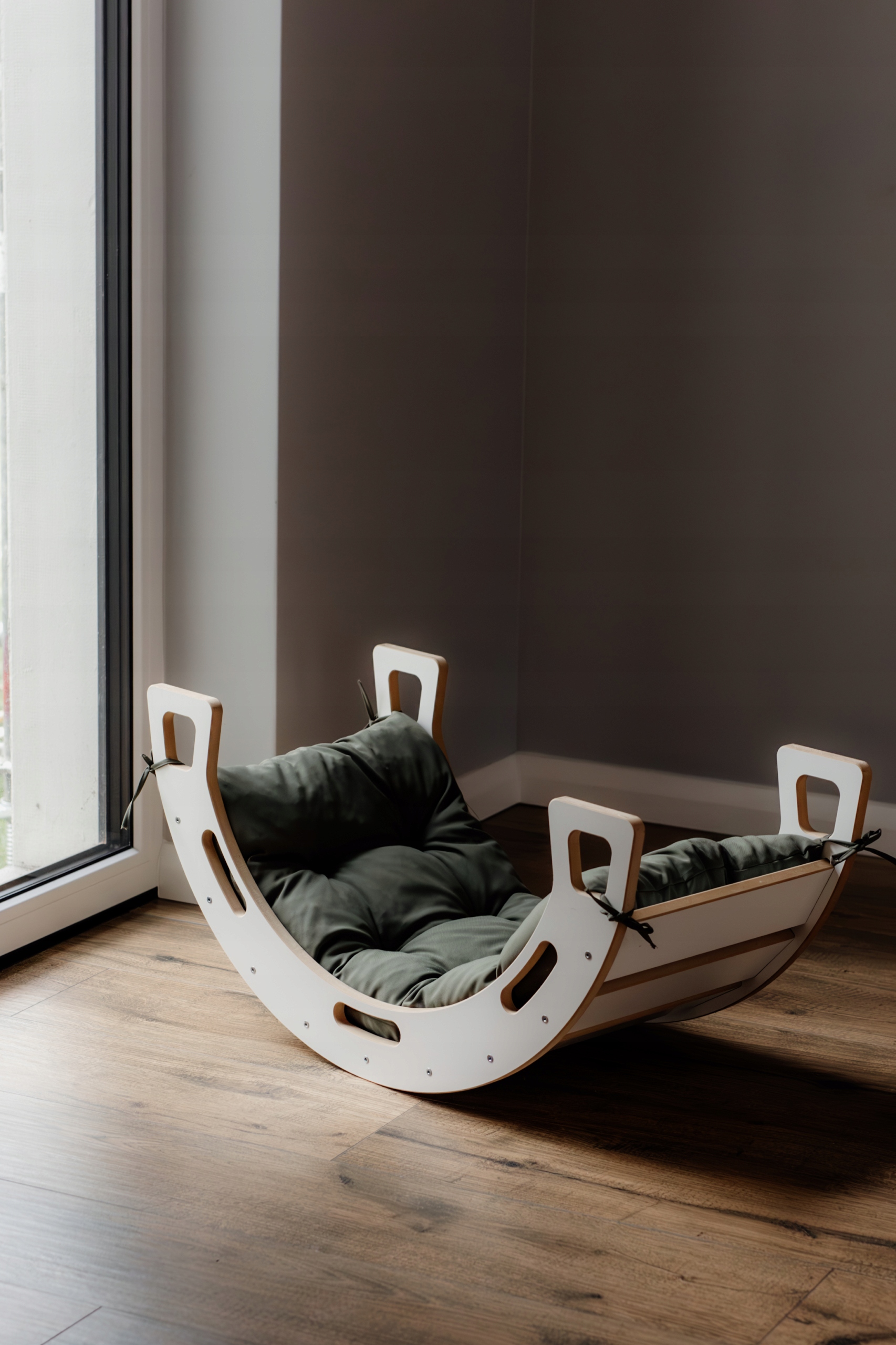 Mega zestaw: Biały bujak dla dziecka + oliwkowa poduszka + zjeżdżalnia ze ścianką wspinaczkową