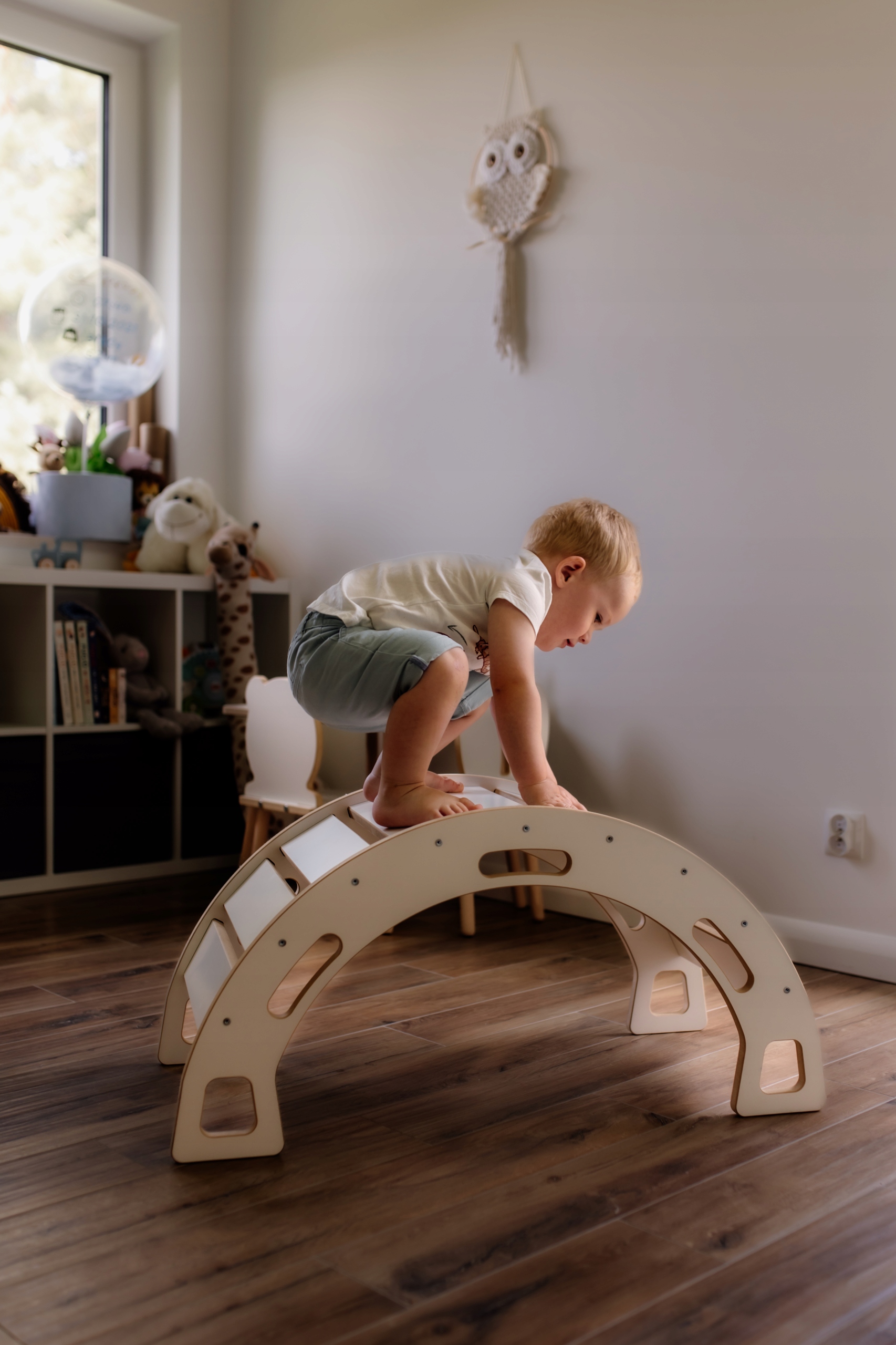 Bujak dla dziecka w kolorze białym ze zjeżdżalnią i ścianką wspinaczkową oraz poduszką to niezwykła zabawka, która dostarczy mnóstwo radości oraz wspomoże rozwój malucha w duchu metody Montessori. Ten fajny bujak Montessori jest nie tylko doskonałym narzędziem do zabawy, ale również idealnym sposobem na ćwiczenie równowagi, koordynacji oraz rozwijanie zdolności motorycznych dziecka.