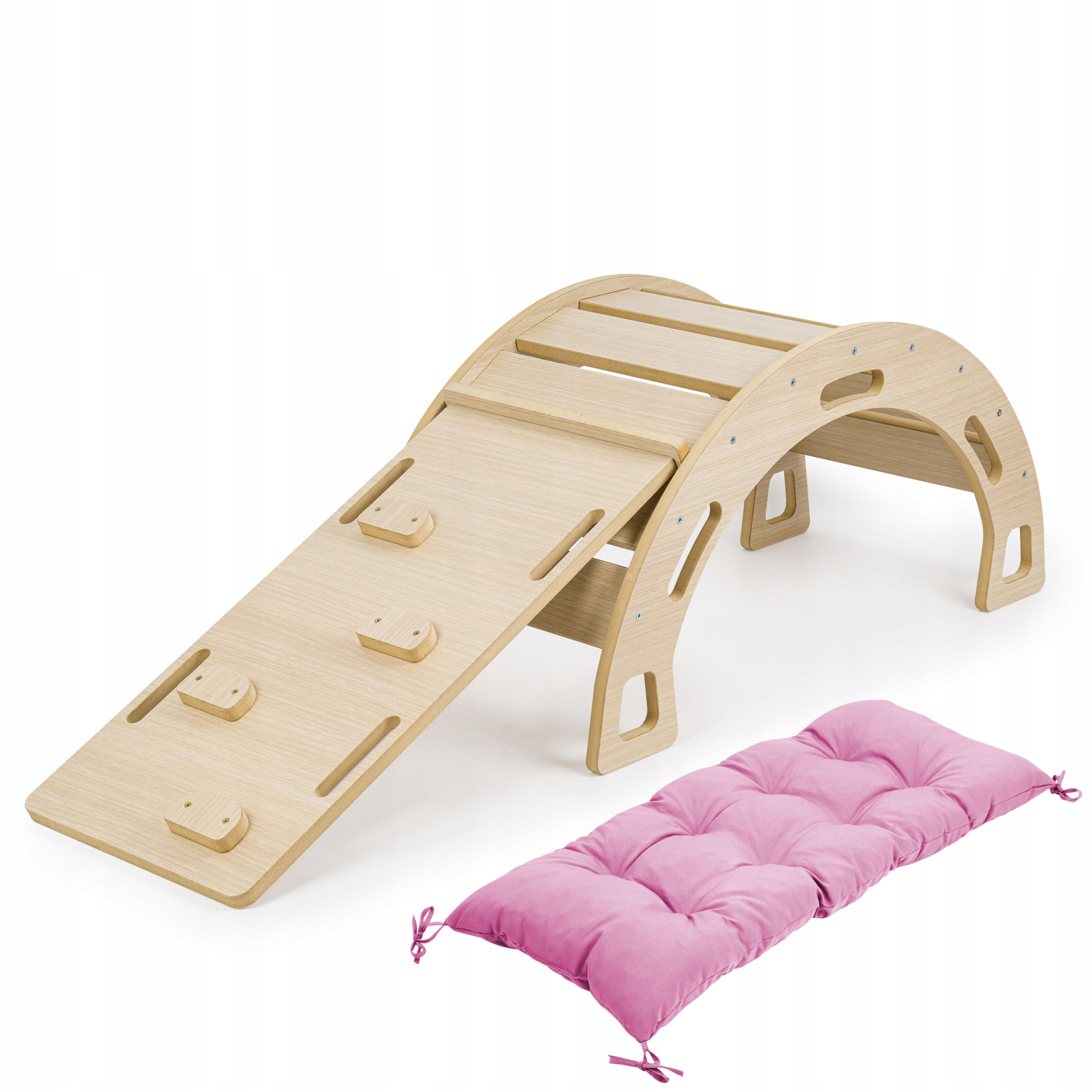 Mega zestaw: Dąb bujak dla dziecka + różowa poduszka + zjeżdżalnia ze ścianką wspinaczkową