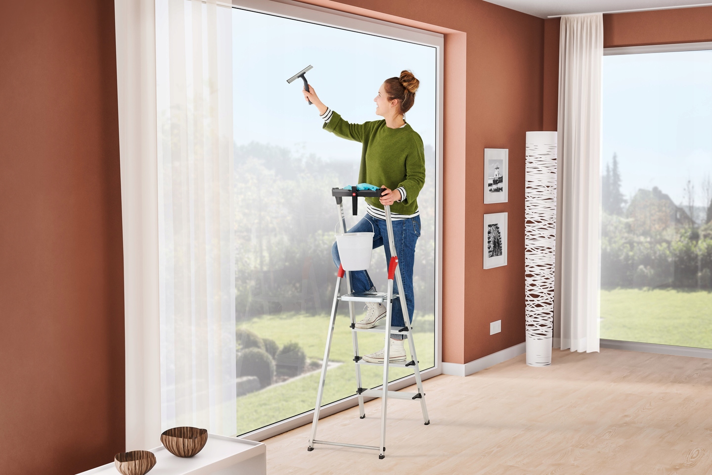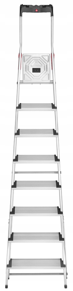 Bezpieczna aluminiowa drabina z wielofunkcyjnym przybornikiem zapewnia bezpieczeństwo w formacie XXL: ekstra szerokie stopnie 13 cm.
