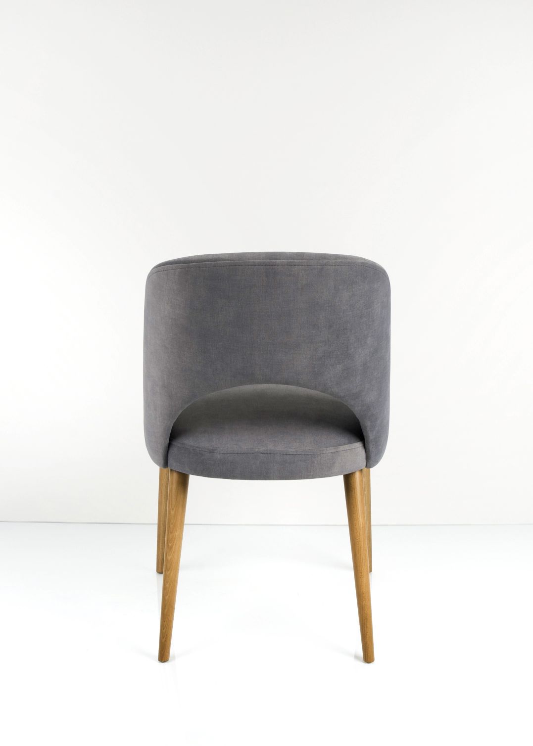 - Miękka tkanina obiciowa pięknie uzupełnia się z drewnianymi nóżkami, dodając szyku i elegancji.