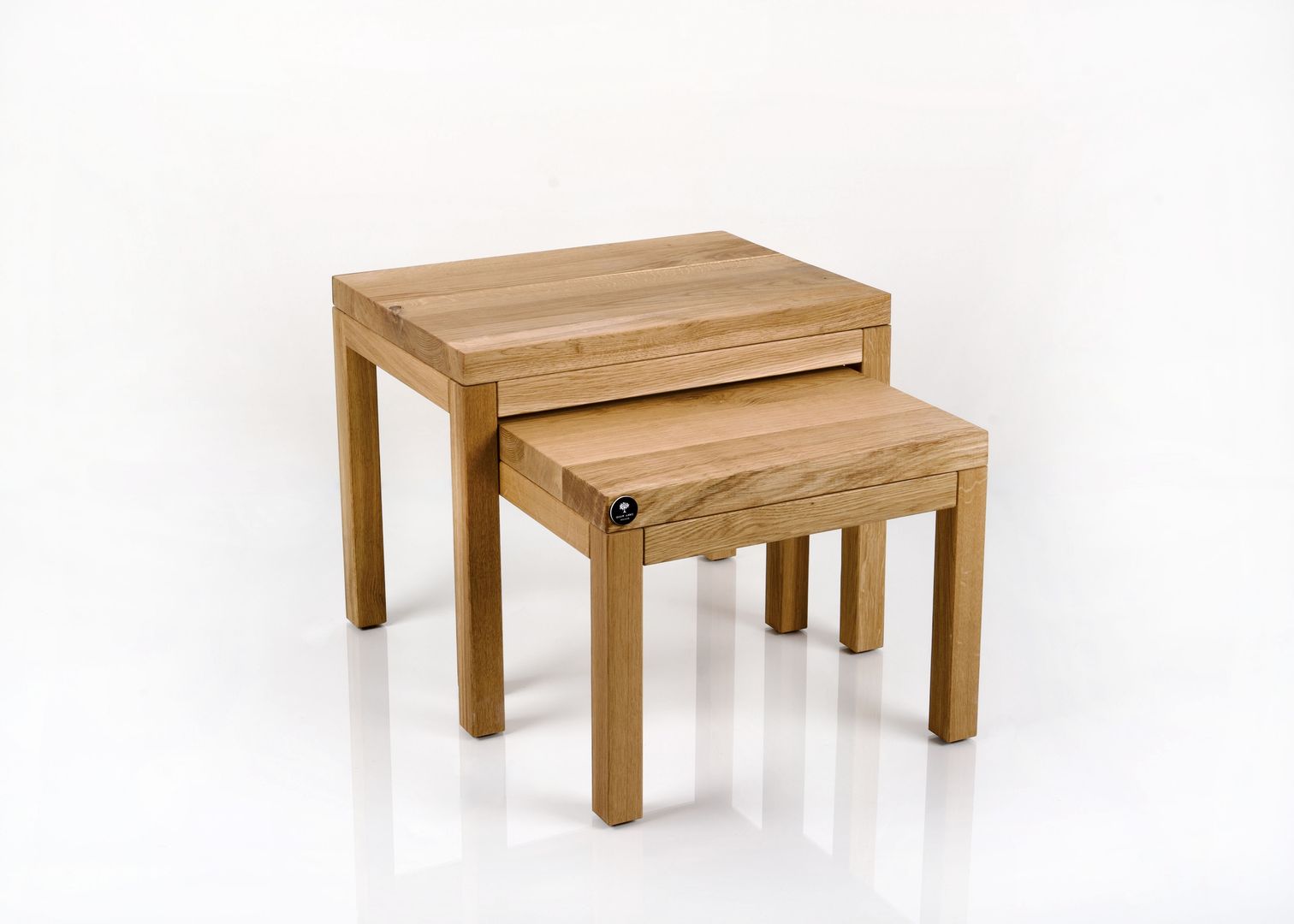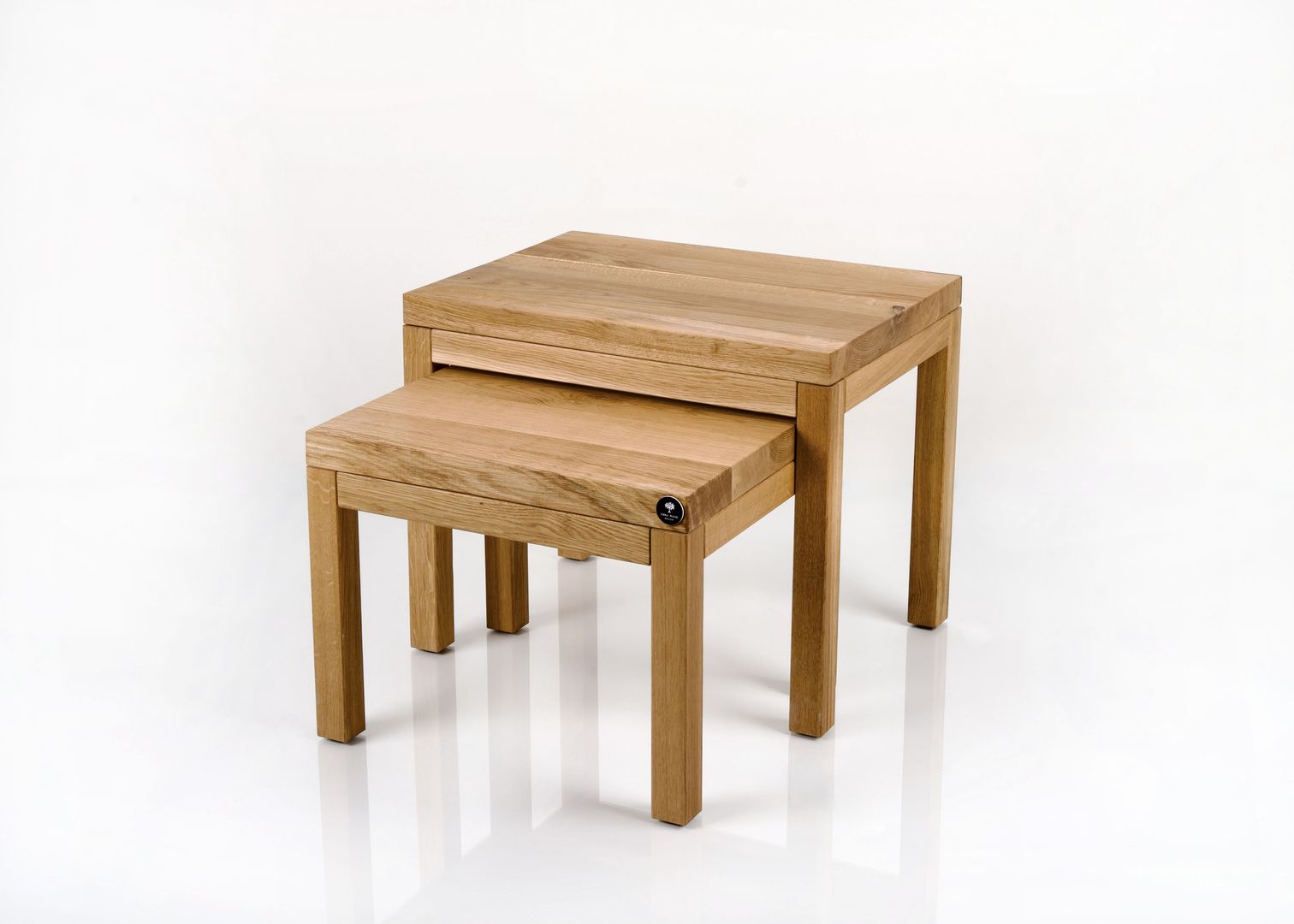 - Stelaż stolików wykonany jest z drewna. Układa się w ciekawą bryłę i jest również bardzo ciekawym elementem dekoracyjnym. Blat zrobiony jest z litego drewna dębowego, które jest niezwykle solidne i trwałe. Proces szczotkowania i olejowania drewna uwydatnia naturalne sęki i słoje, podkreśla strukturę naturalnego materiału.