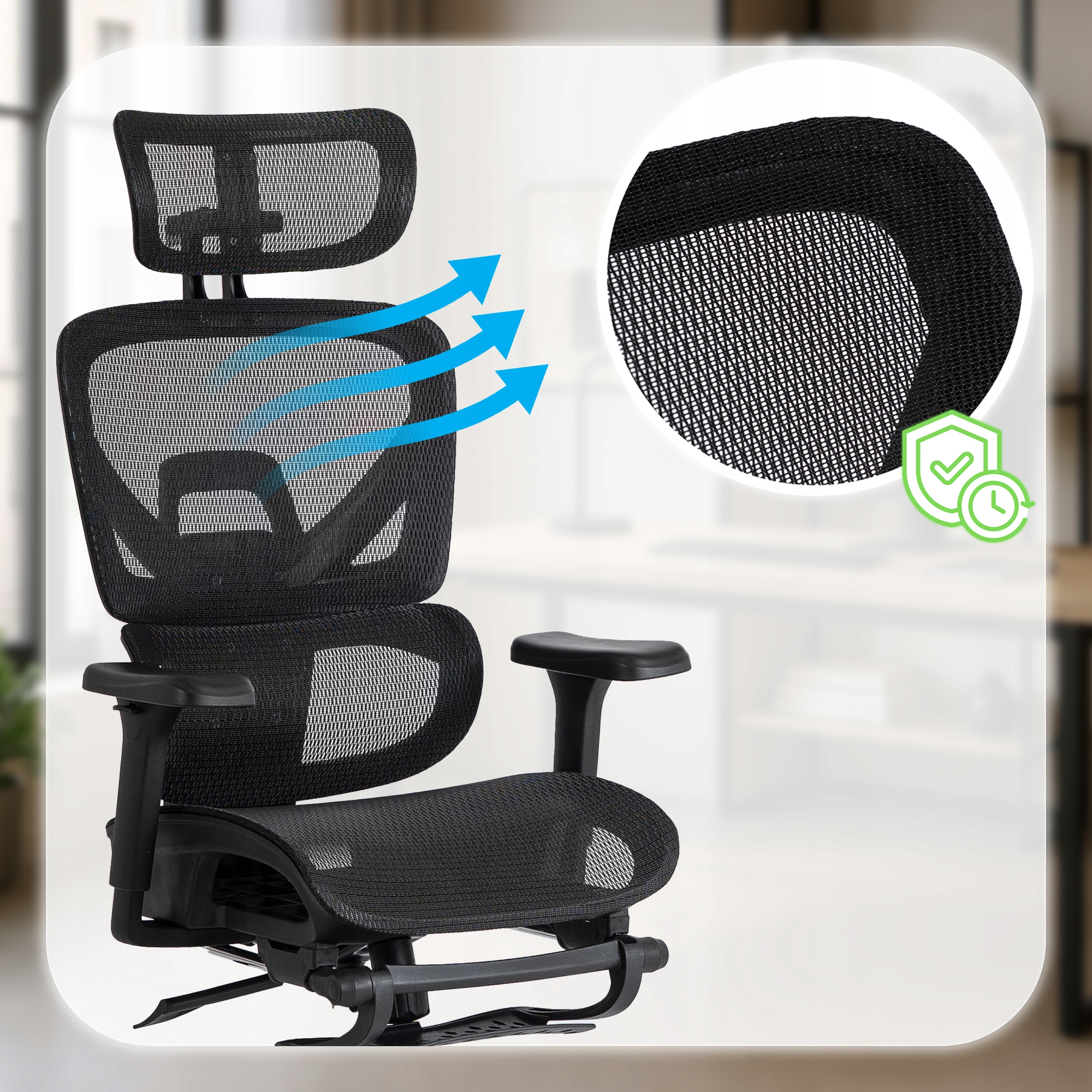 - Wyprofilowane oparcie z elastycznej siatki zapewnia doskonałą wentylację i wsparcie dla kręgosłupa przez cały dzień.