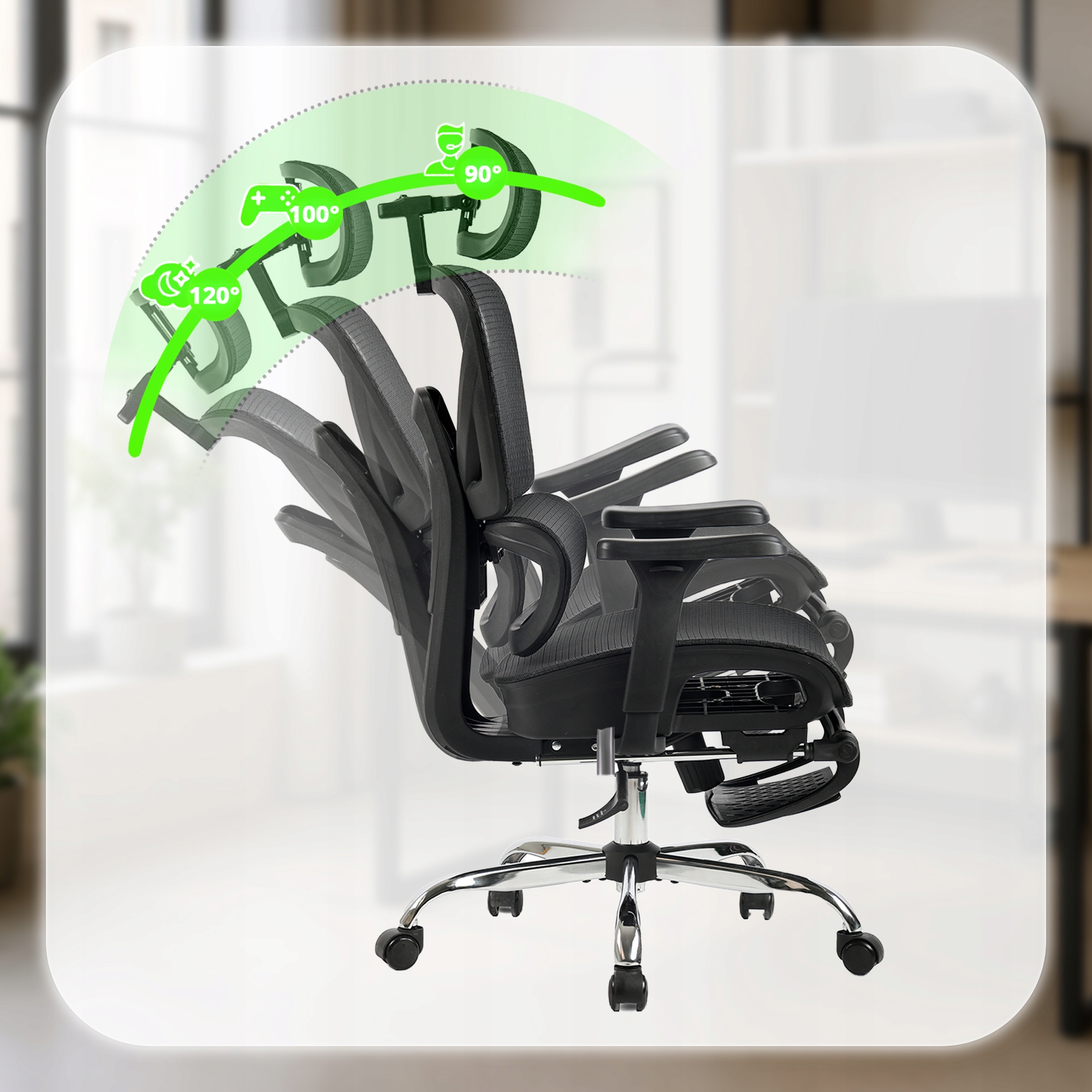 Fotel oferuje odchylenie oparcia w zakresie od 90° do 120° co sprawia, że idealnie sprawdza się zarówno podczas pracy (90°), jak i w chwilach relaksu w pozycji półleżącej.