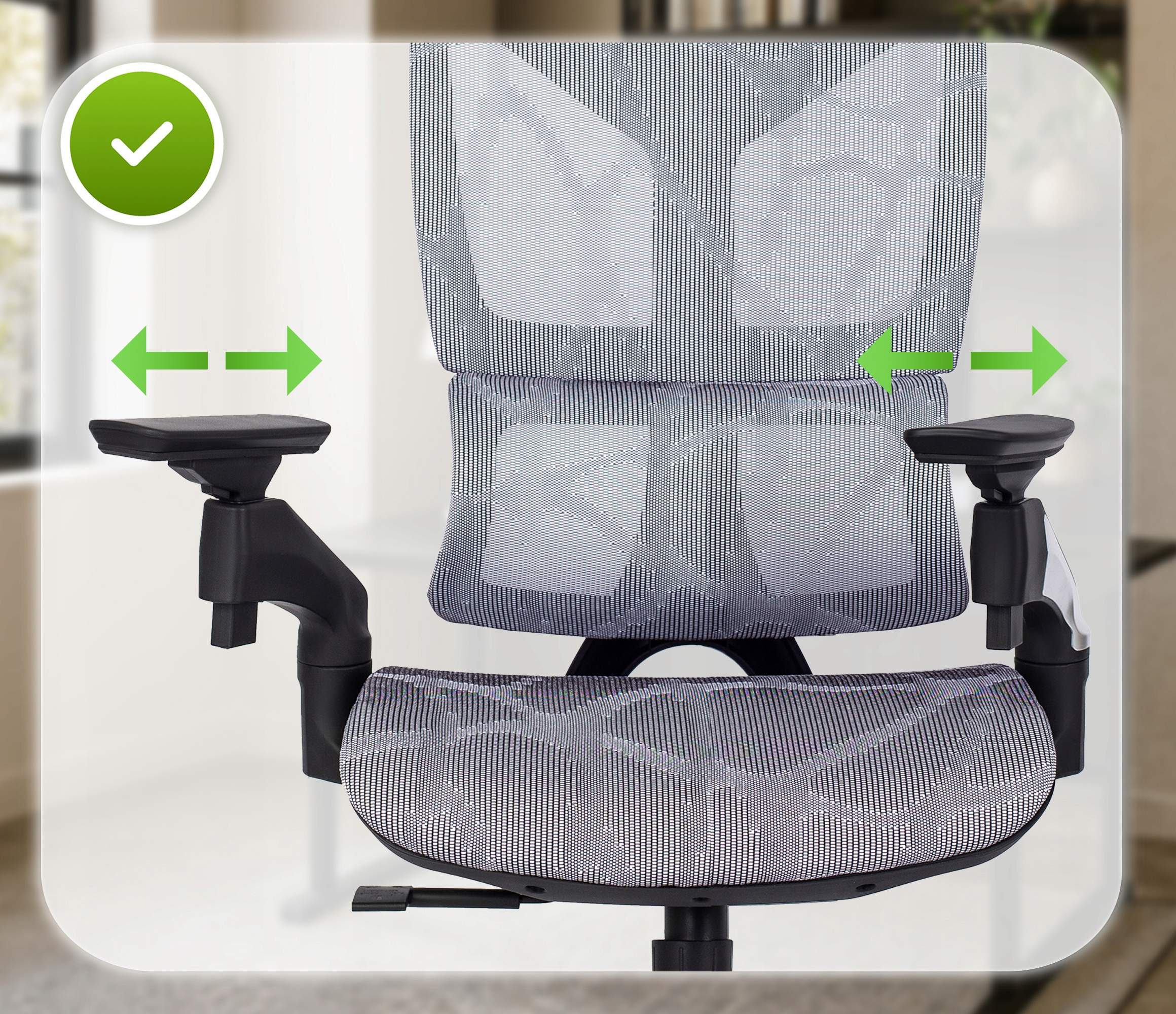 - Góra–dół – regulacja wysokości umożliwia dopasowanie podłokietników do poziomu biurka i pozycji siedzenia, redukując napięcie w barkach i ramionach.