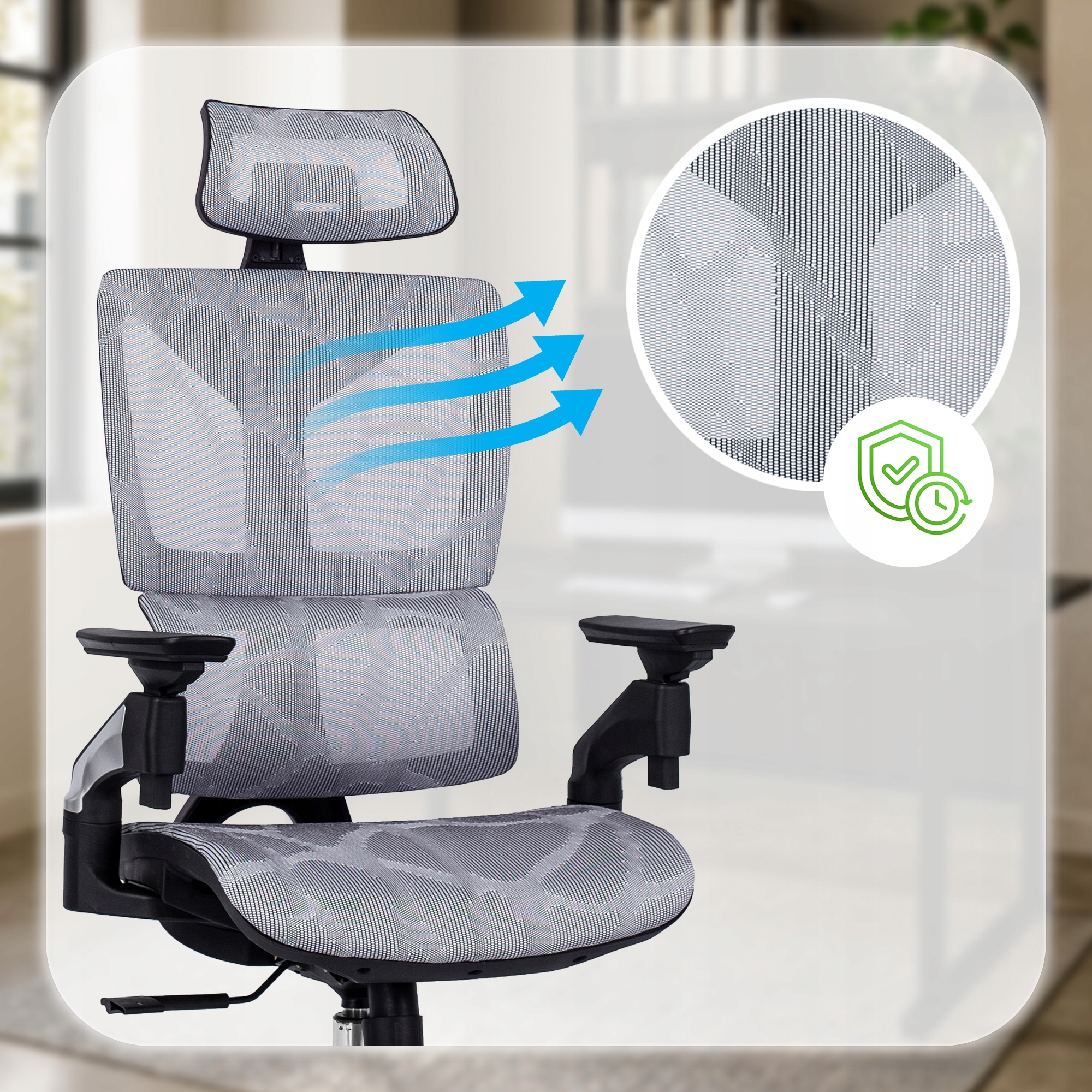 - Wyprofilowane oparcie z elastycznej siatki zapewnia doskonałą wentylację i wsparcie dla kręgosłupa przez cały dzień.