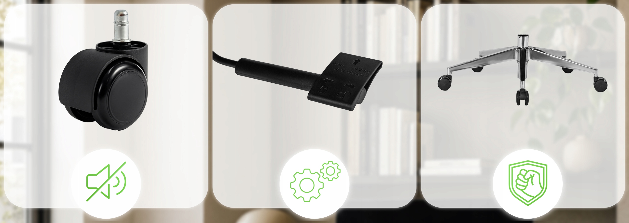 ✅ Ciche kółka – zapewniają płynne i bezgłośne przemieszczanie się po różnych powierzchniach, nie rysując podłogi.