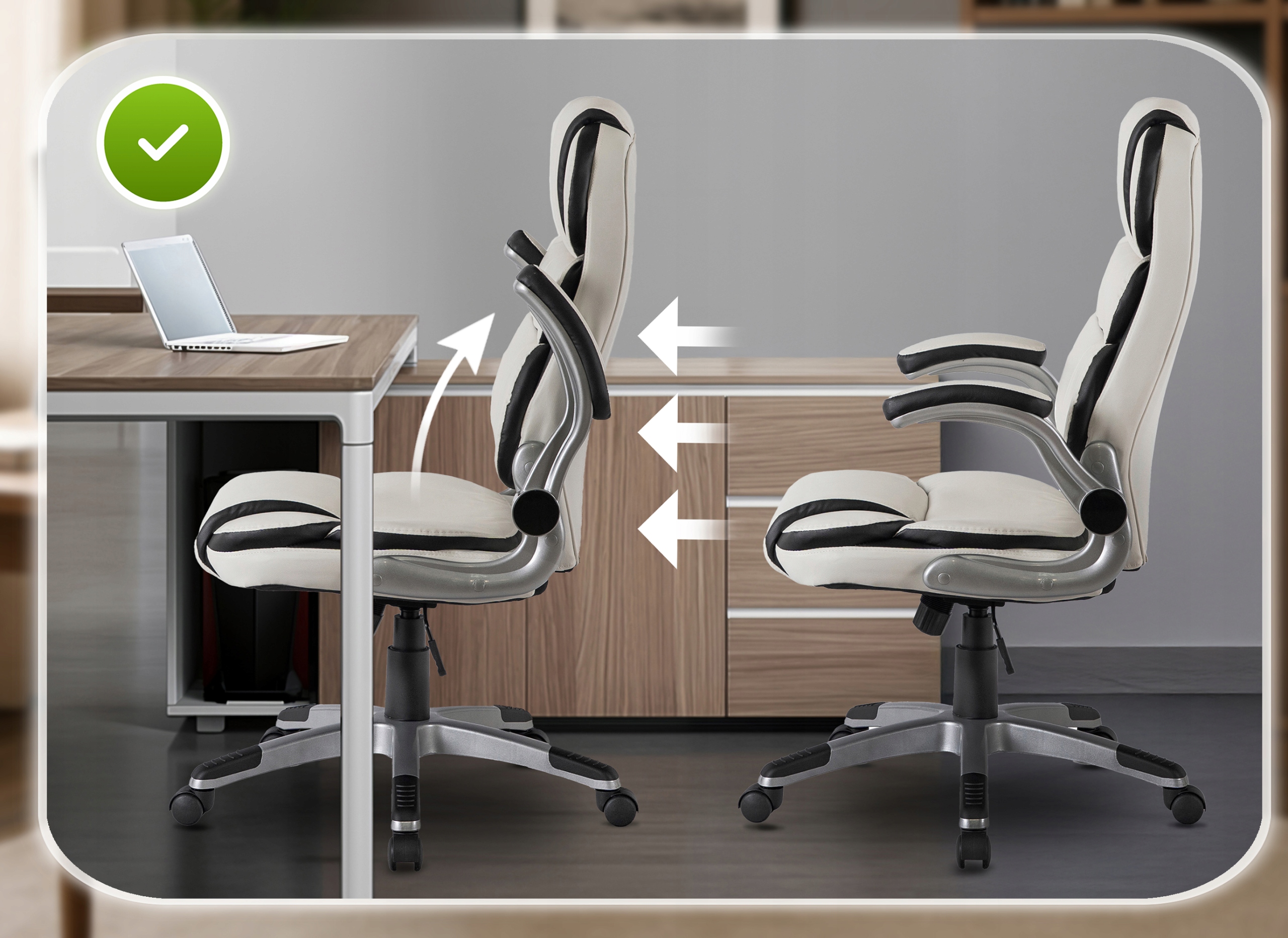 Fotel LIVERPOOL wyposażony jest w funkcję unoszonych podłokietników, co pozwala z łatwością wsunąć fotel pod biurko i zaoszczędzić miejsce w pomieszczeniu.