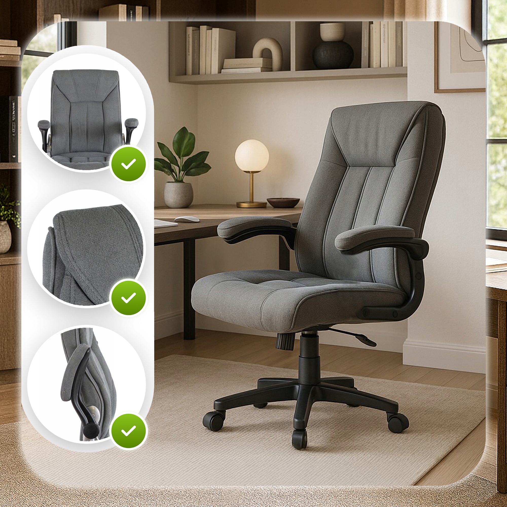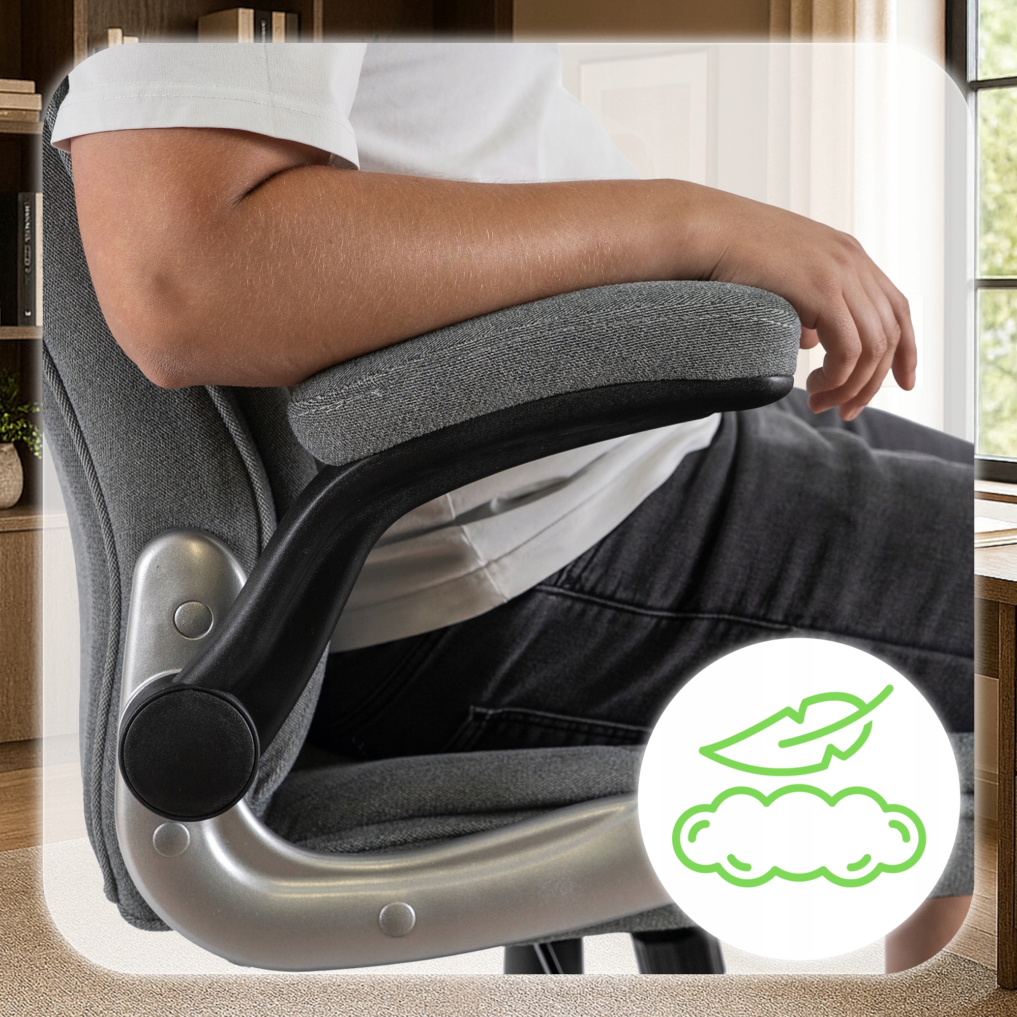 - Podnoszone podłokietniki – zapewniają wygodne podparcie rąk i pozwalają wsunąć fotel pod biurko.
