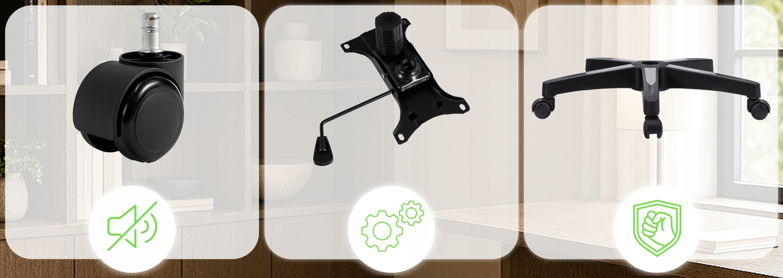 ✅ Ciche kółka – zapewniają płynne i bezgłośne przemieszczanie się po różnych powierzchniach, nie rysując podłogi.