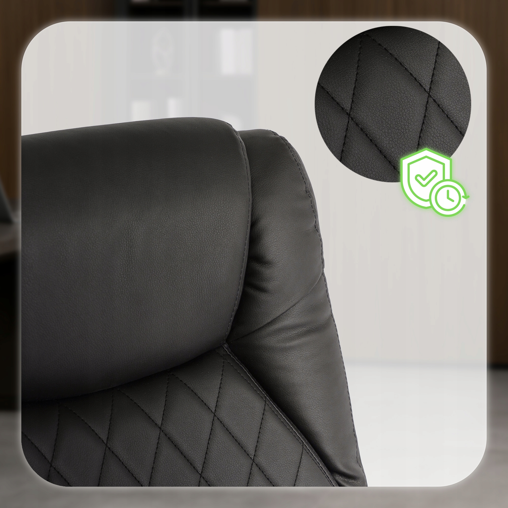 Fotel tapicerowany jest wysokiej jakości ekoskóry odporną na ścieranie, a solidna konstrukcja z metalową podstawą i wygodnymi podłokietnikami zapewnia trwałość na długie lata.