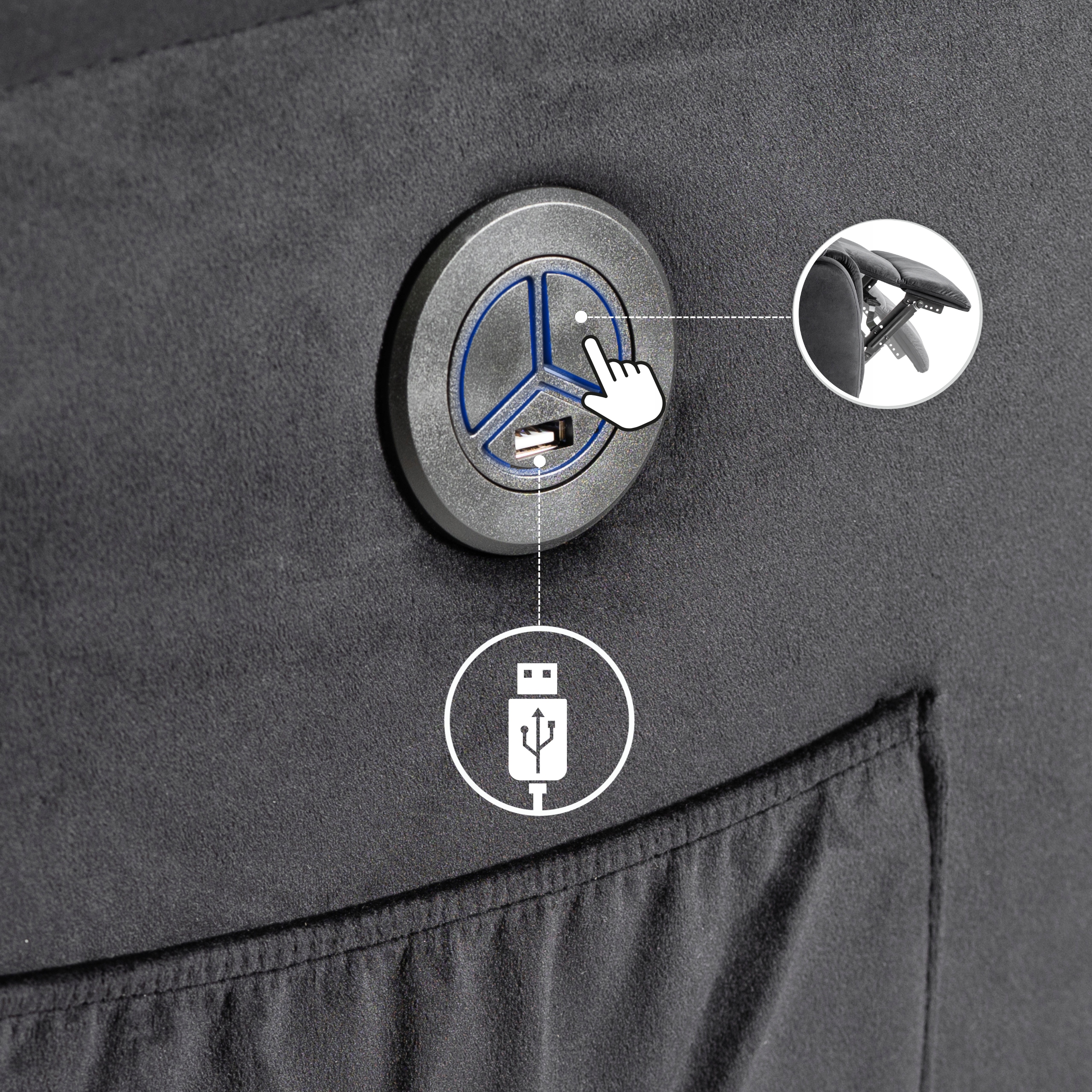 Panel posiada podświetlenie LED, które zaświeci się wraz z podłączeniem fotela do prądu.