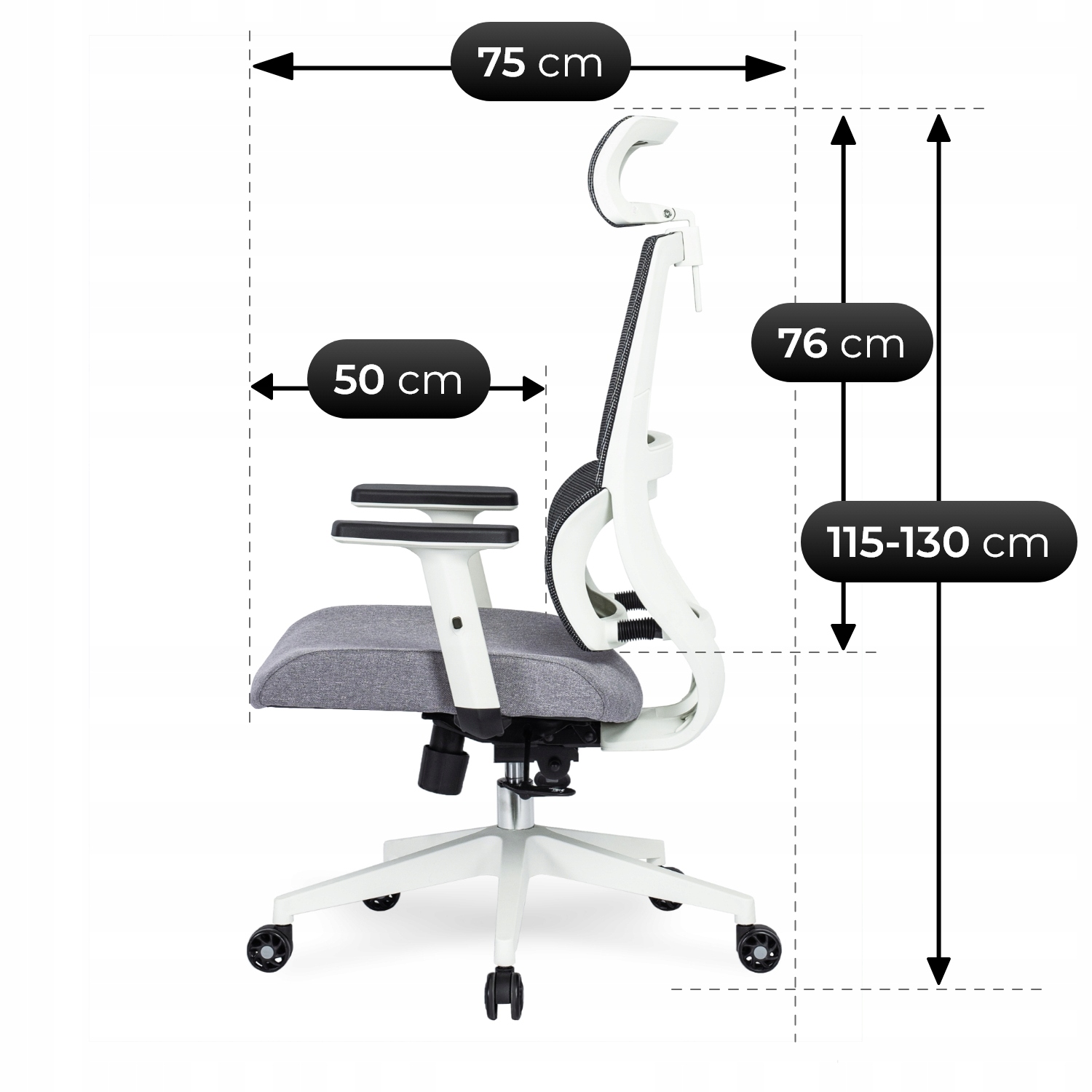 - Wysokość całkowita fotela: 115 – 130 cm