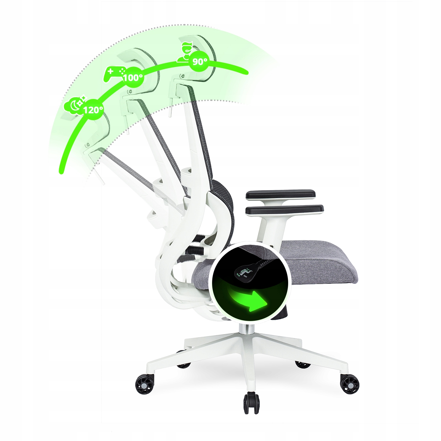 Fotel oferuje odchylenie oparcia w zakresie od 90° do 120° co sprawia, że idealnie sprawdza się zarówno podczas pracy (90°), jak i w chwilach relaksu w pozycji półleżącej.
