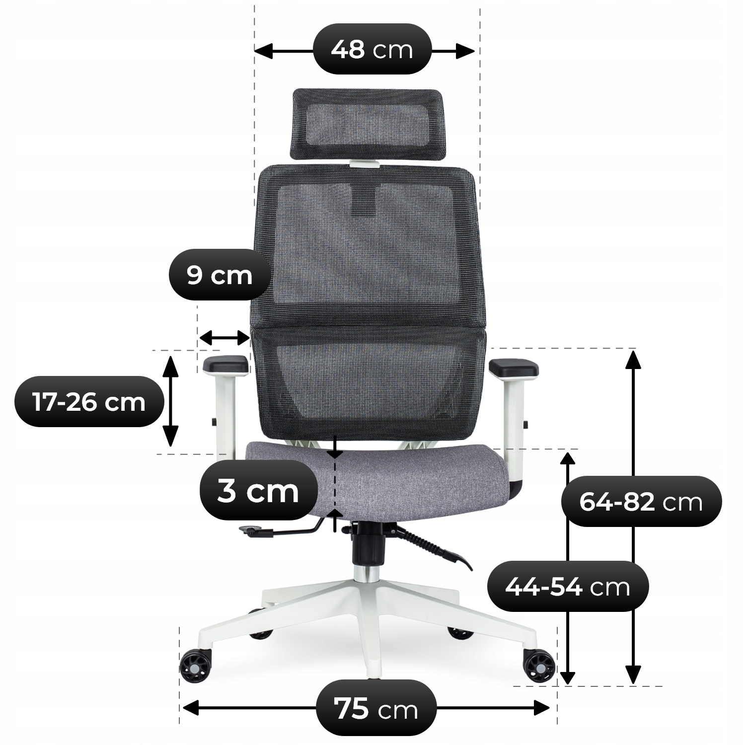- Zakres regulacji podłokietników (wysokość): 18,5 – 27 cm