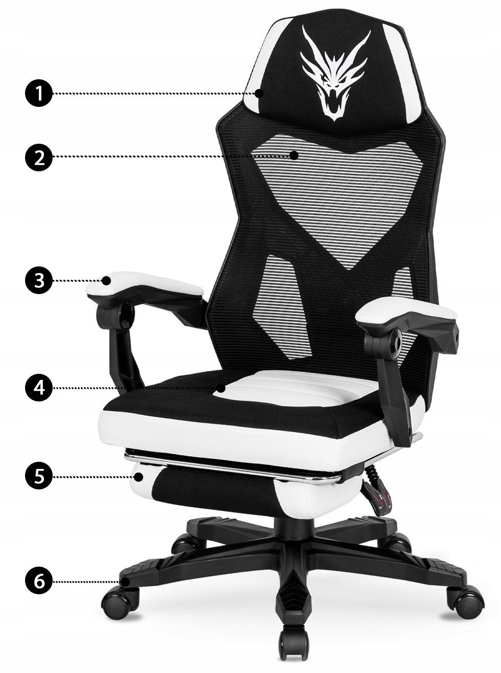1. ✅ Wyprofilowane oparcie z zagłówkiem - doskonale dopasowuje się do pleców, tapicerowany zagłówek jest wypełniony pianką i znajduje się na nim efektowny wzór, nadający fotelowi gamingowy pazur.