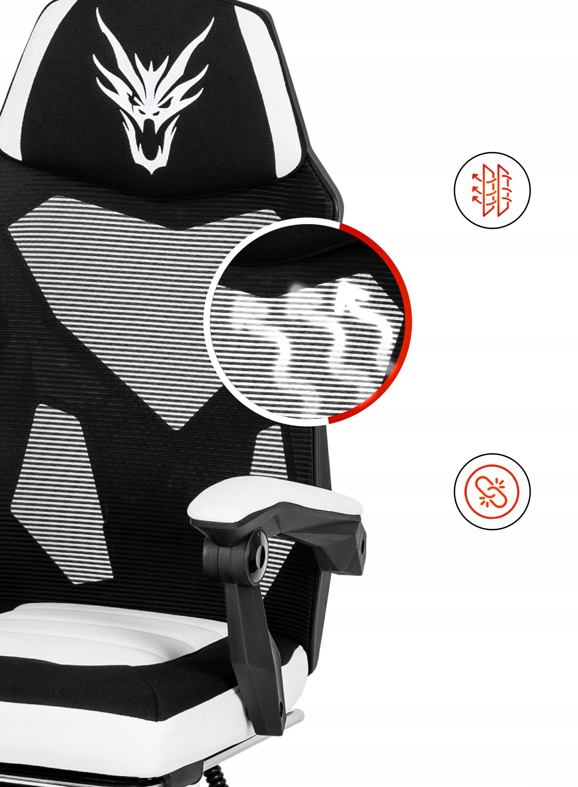 Pamiętaj, że tapicerka fotela obrotowego nie jest bez znaczenia. Fotel przeznaczony do gamingu nie może być tapicerowany przypadkową tkaniną. W modelu BING oparcie zostało pokryte specjalną mikro-siatką typu Air Mesh. To wentylowany, dobrze dostosowujący się do kształtu sylwetki materiał. Umożliwia też doskonały przepływ powietrza, co sprawdzi się świetnie, szczególnie w cieplejsze dni.