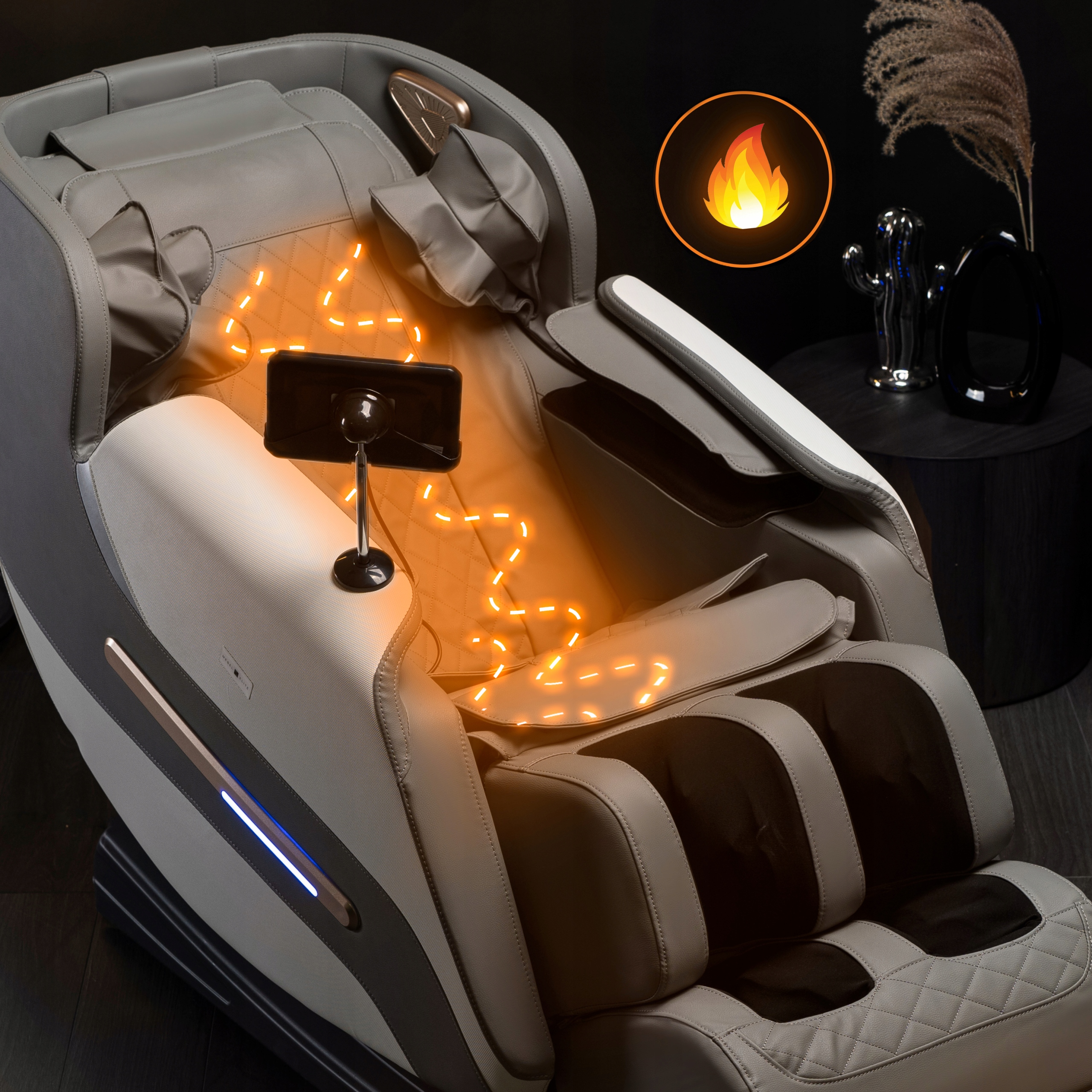 Oświetlenie fotela masującego pełni kilka funkcji, w tym poprawę atmosfery relaksacyjnej i ułatwienie korzystania z fotela w ciemności. Delikatne światło może wspomagać relaksację, wpływając korzystnie na nastrój użytkownika.