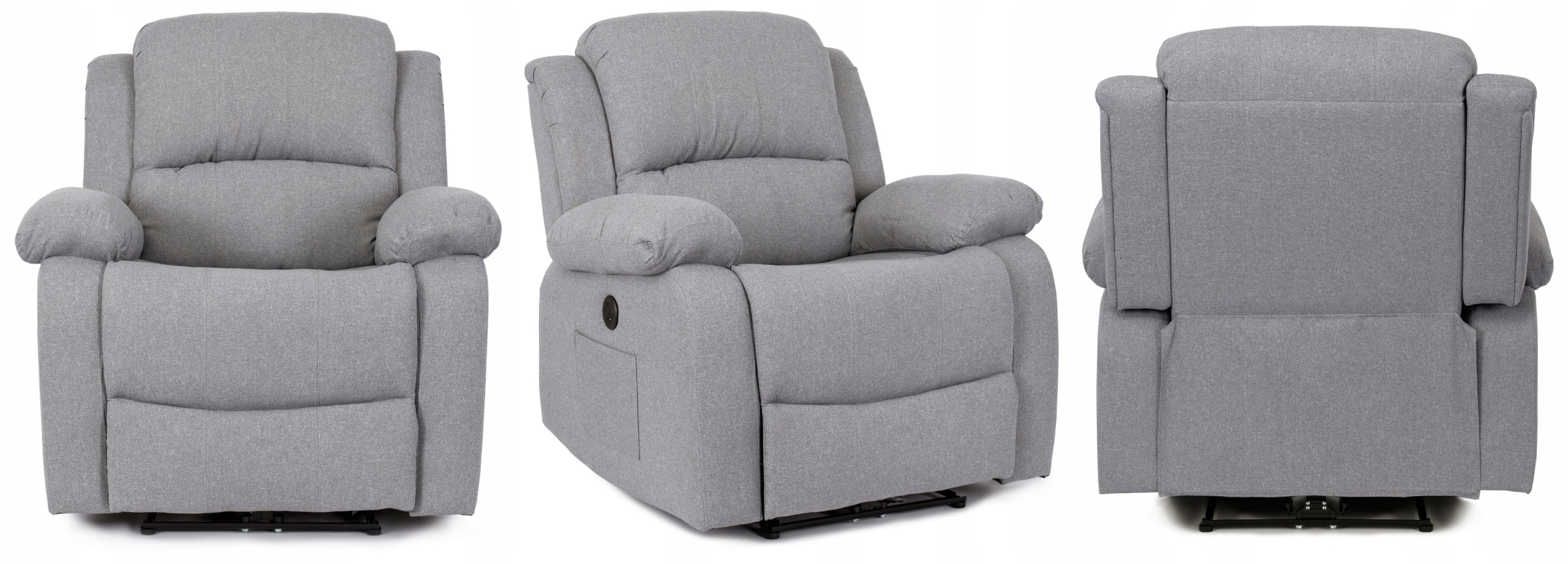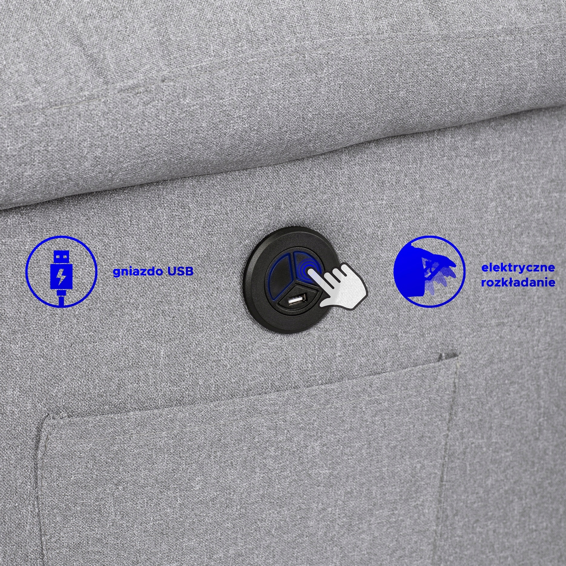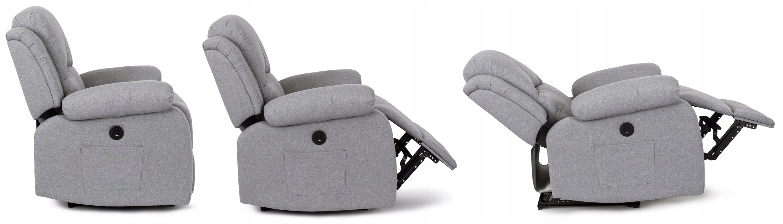 Fotel rozkładany elektrycznie to wygodny i stylowy mebel z 3 pozycjami rozłożenia, idealny do relaksu. Wykonany z wytrzymałej tkaniny w szarym kolorze, świetnie sprawdza się w codziennym użytkowaniu.
