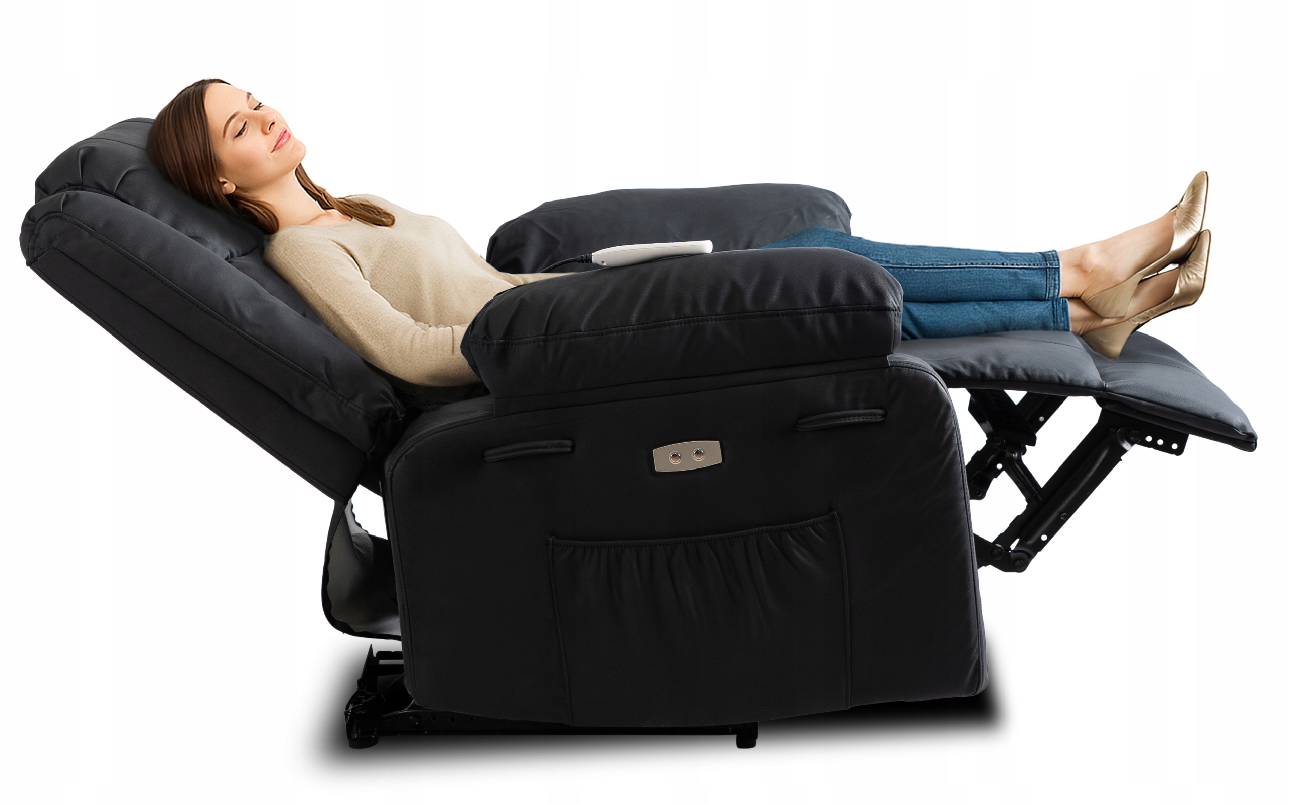 Pozycja półsiedząca z uniesionym podnóżkiem – perfekcyjna do czytania, oglądania TV czy popołudniowej drzemki. Miękkie wypełnienie fotela otula ciało, a solidny, metalowy stelaż i cichy mechanizm zapewniają stabilność i wygodę użytkowania.