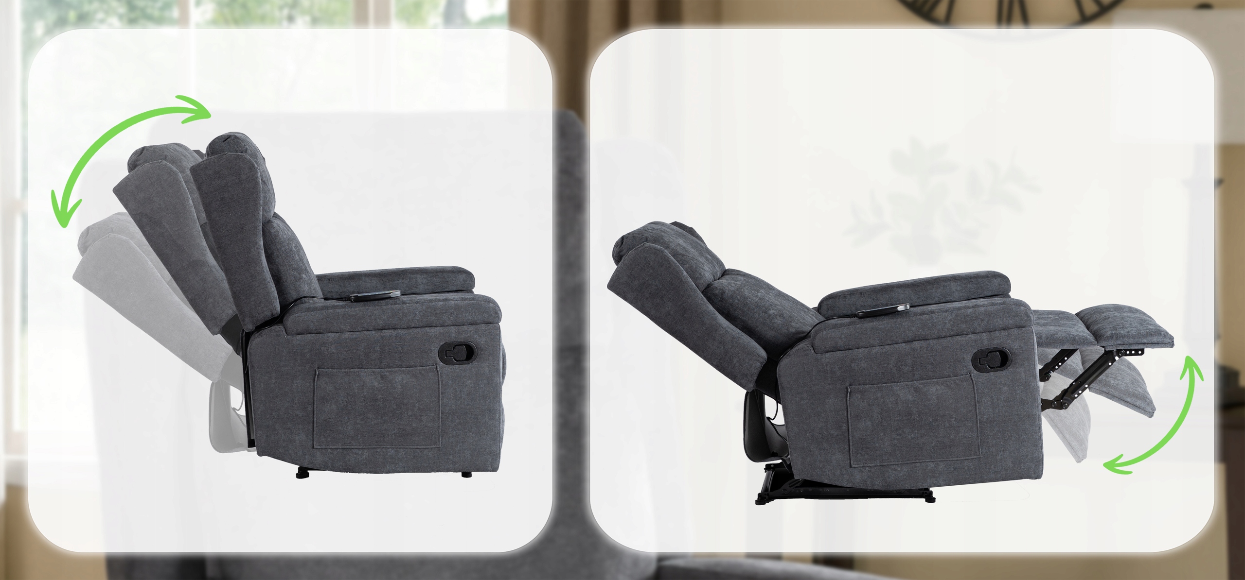 Fotel SEBASTIAN został wyposażony w mechanizm, który umożliwia osobne rozkładanie podnóżka i oparcia. Dzięki temu sam decydujesz, czy chcesz tylko unieść nogi, czy dodatkowo odchylić plecy – pełna swoboda w dopasowaniu pozycji do Twoich potrzeb.
