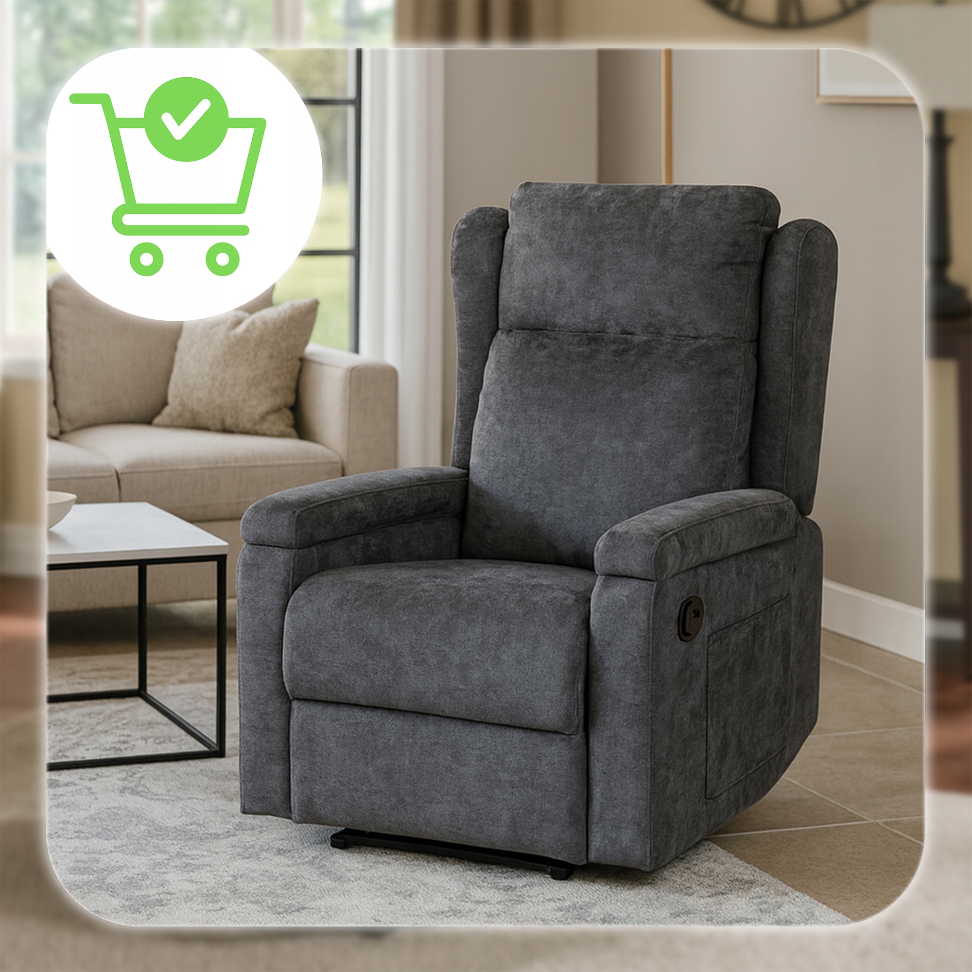 • Rozkładany – opuszczone oparcie i uniesiony podnóżek pozwalają uzyskać komfortową pozycję półleżącą lub leżącą.