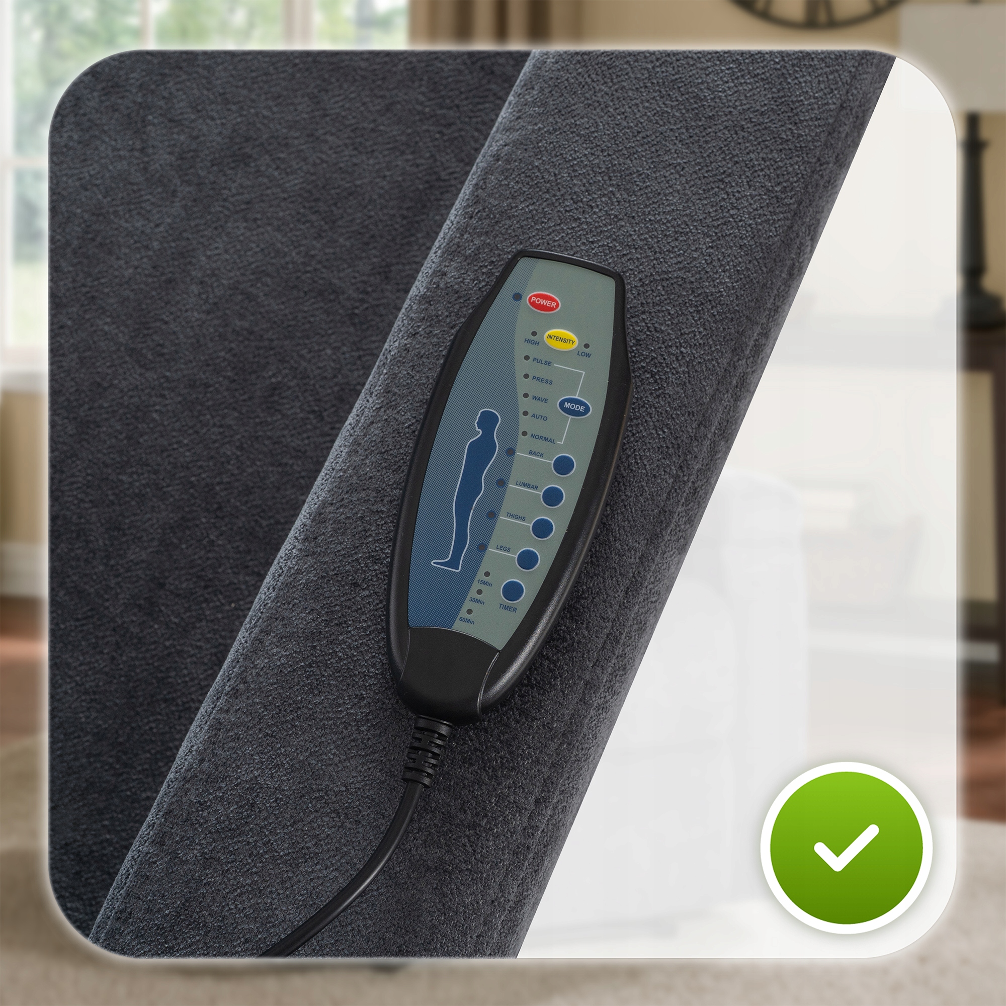 Pilot do fotela SEBASTIAN oferuje pełną kontrolę nad funkcją masażu – wszystko w zasięgu ręki.