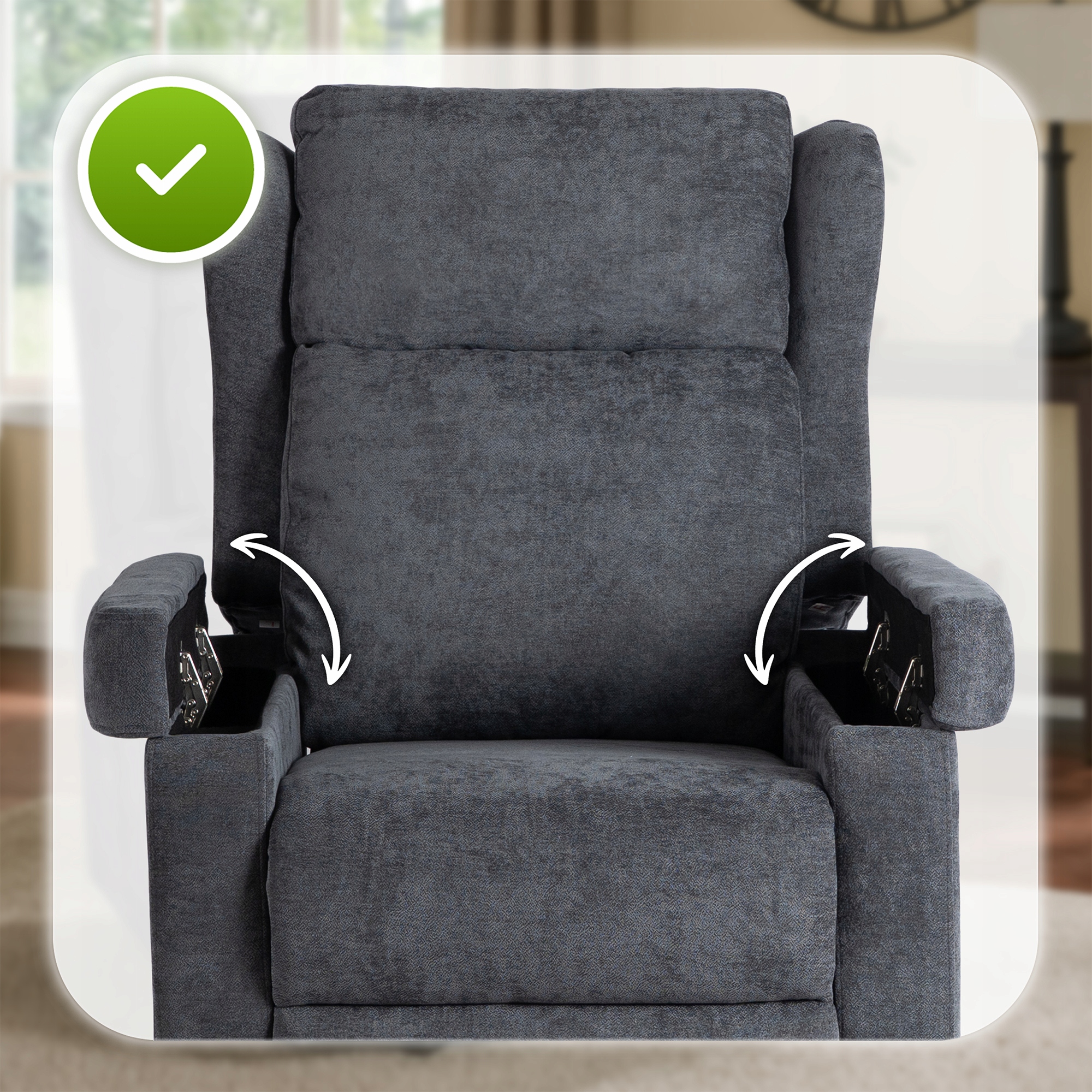Podłokietniki można otworzyć, uzyskując wtedy dostęp do schowków. Pomysłowe i dyskretne rozwiązanie dla Twojej wygody. W schowkach można trzymać gazety, książki i tym podobne przedmioty lub akcesoria.
