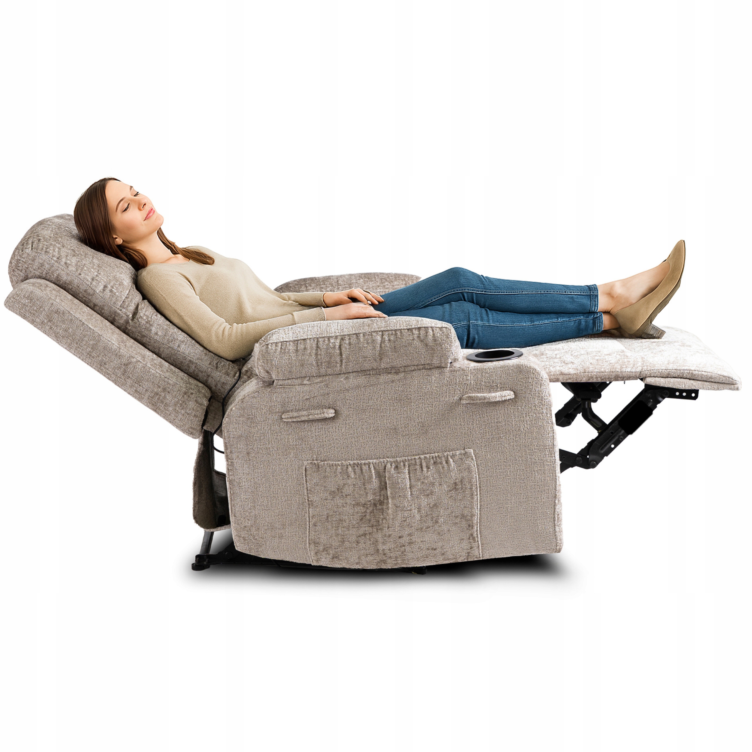 ✨ Fotel BOX to doskonałe połączenie nowoczesnego designu z wygodą. Jest rozkładany do pozycji półleżącej i posiada sterowaną pilotem funkcję masażu. Ma wypełnienie z grubej warstwy pianki tapicerskiej, więc jest miękki i siedzi bądź leży się w nim naprawdę komfortowo. Fotel pokryty jest wysokiej jakości tkaniną welurową w beżowym kolorze, która dodaje elegancji.