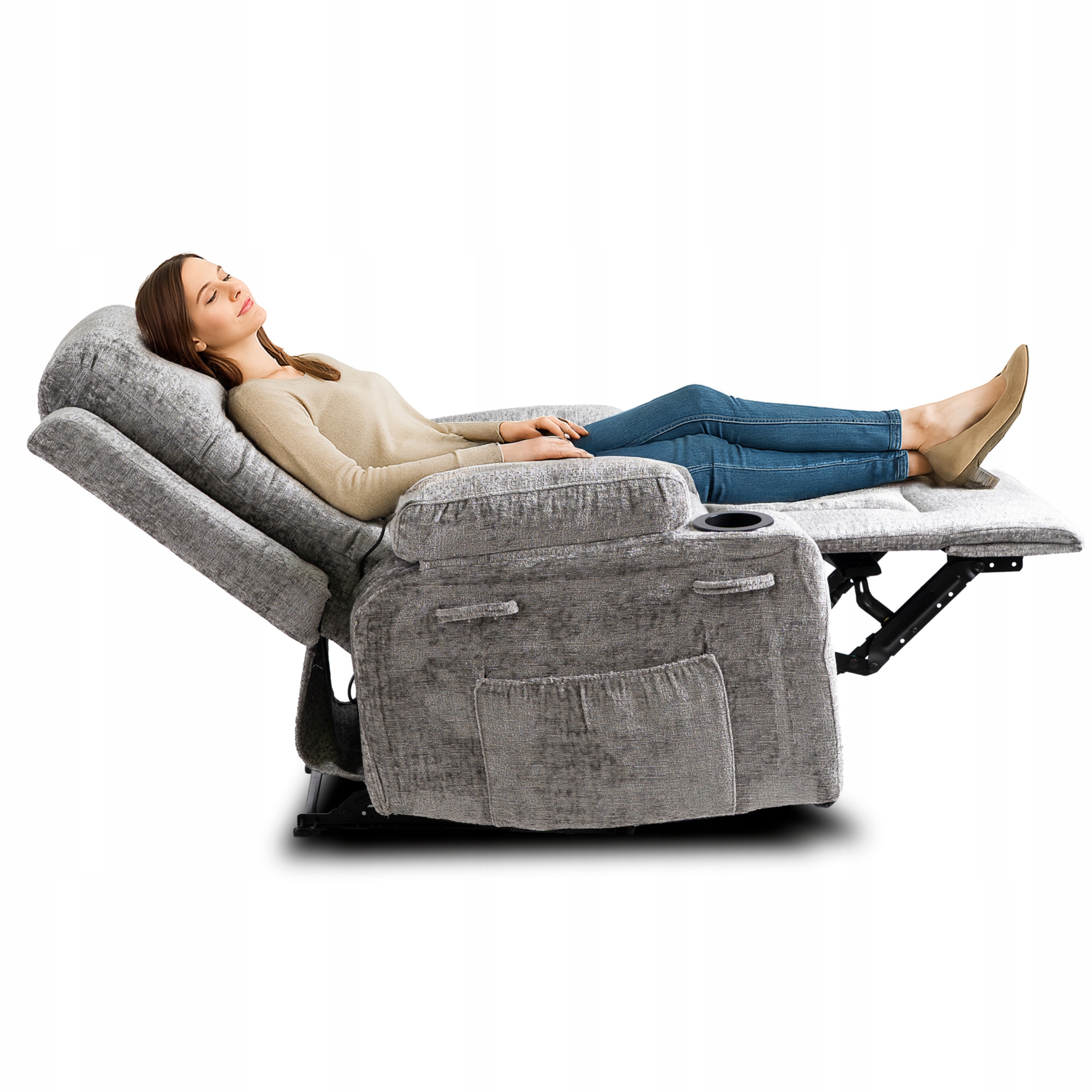 Rozkładanie fotela jest bardzo proste. W celu rozłożenia fotela należy pociągnąć za czarny uchwyt, znajdujący się po wewnętrznej stronie prawego podłokietnika, co spowoduje zwolnienie blokady i uniesienie podnóżka oraz możliwość rozłożenia oparcia poprzez opieranie się o nie plecami.