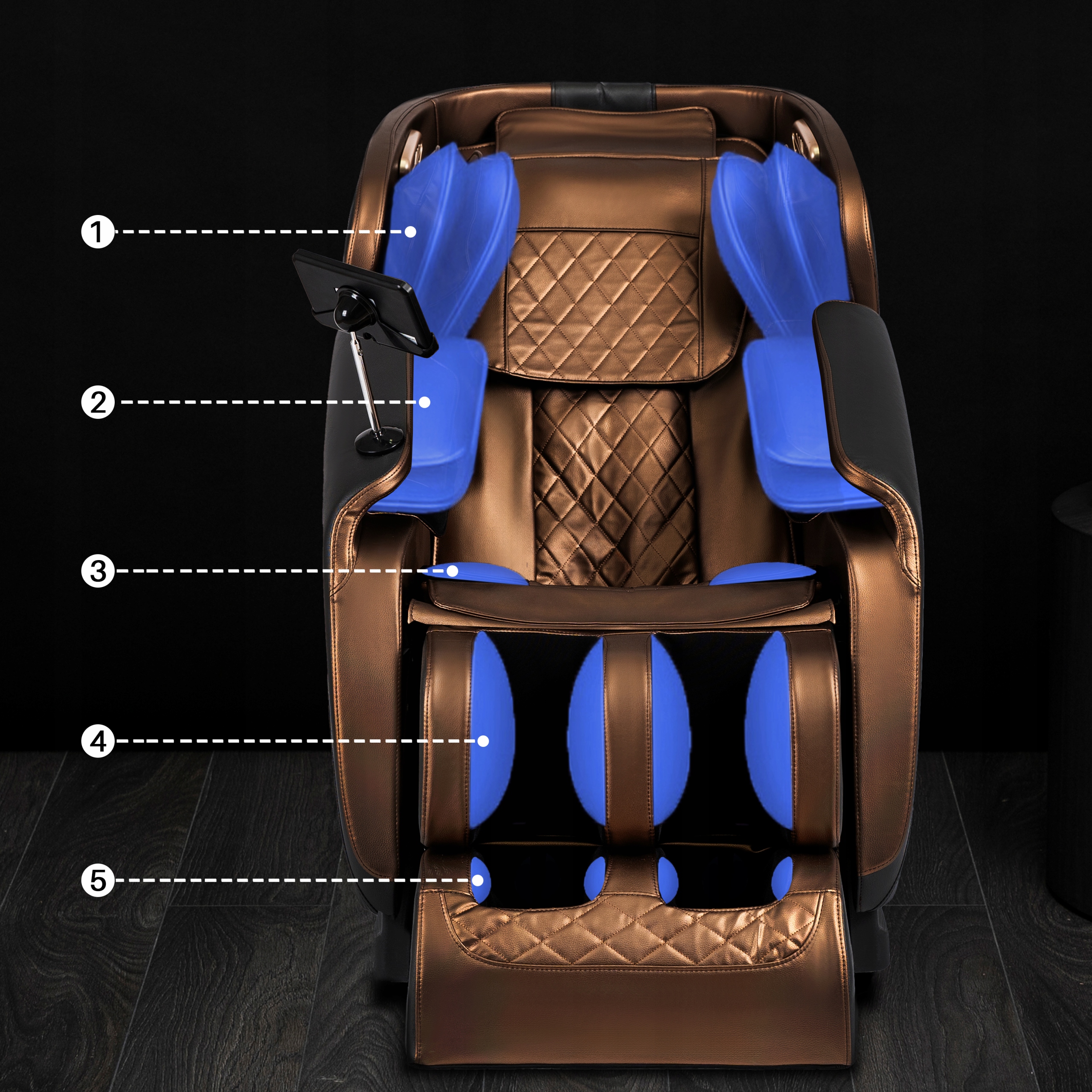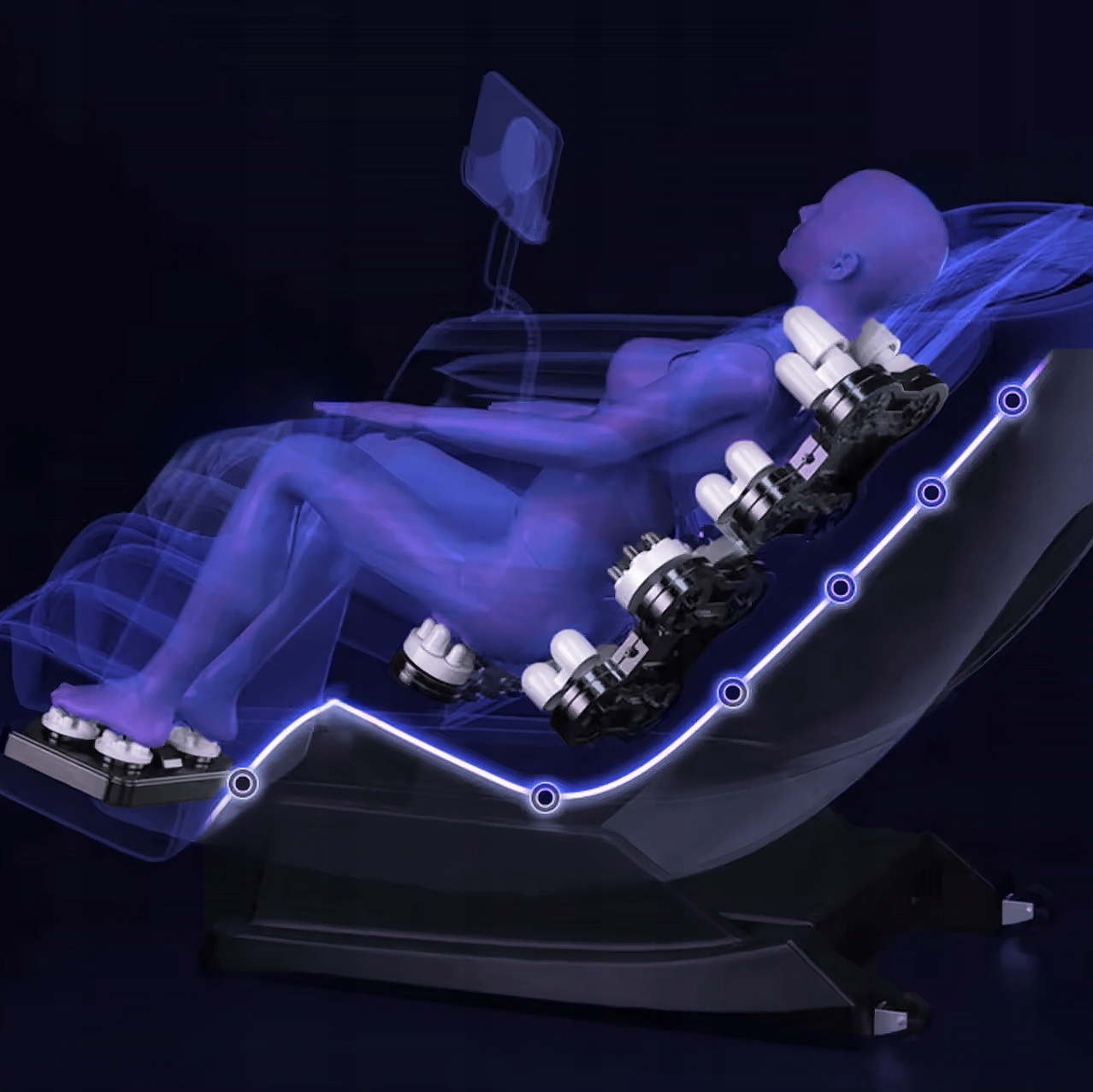 Po ciężkim dniu zazwyczaj nasze łydki i stopy wymagają specjalnej uwagi. W zależności od wzrostu czy też długości nóg, część masująca kolana jest elektrycznie regulowana co do swojej pozycji. Nasz fotel oferuje masaż limfatyczny łydek w technice kompresji powietrznej oraz rolkowy masaż podeszwy stóp połączony z uciskiem poduszkami. Dzięki takiej terapii połączonej z możliwością dopasowania długości całego podnóżka, Twoje obolałe i opuchnięte nogi dostaną to na co zasługują: luksusowe spa na koniec dnia!