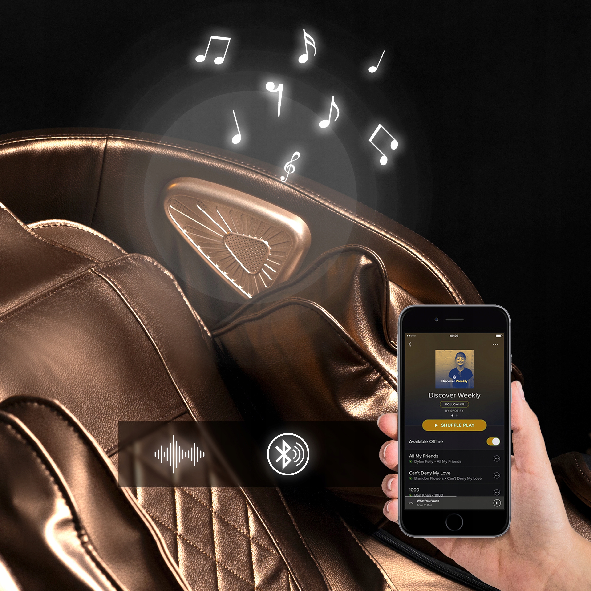 Dzięki wbudowanym głośnikom wraz z systemem Bluetooth możesz połączyć się ze swoim telefonem i odprężyć się przy swoich ulubionych piosenkach. Muzyczna terapia, dodaje kolejny wymiar relaksowi, tworząc chwile wewnętrznego spokoju.