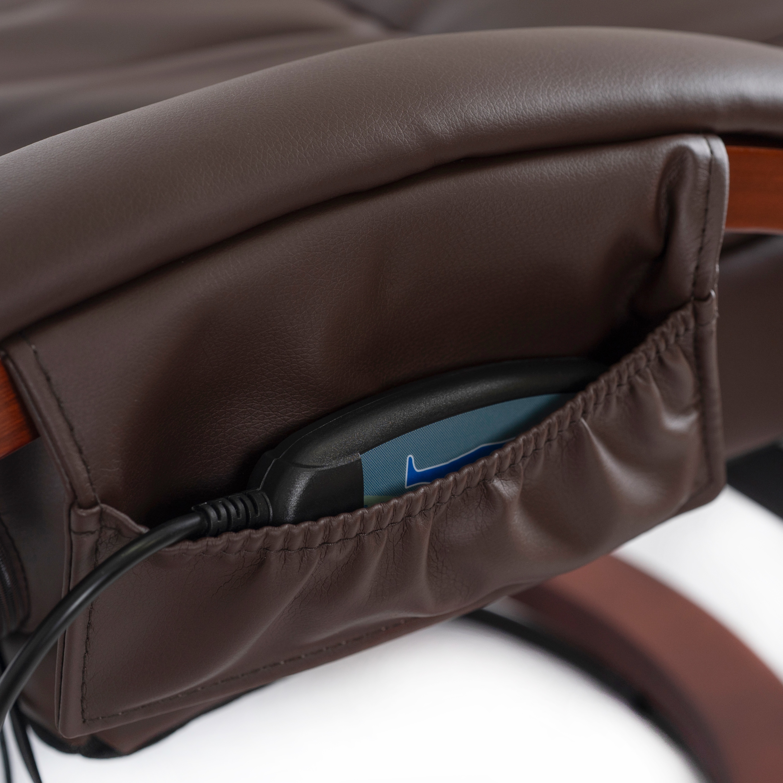 Dodatkowo pilot ma swoje stałe miejsce – poręczną boczną kieszeń, dzięki której zawsze jest pod ręką. To rozwiązanie sprawia, że korzystanie z fotela jest nie tylko komfortowe, ale też wyjątkowo wygodne na co dzień.