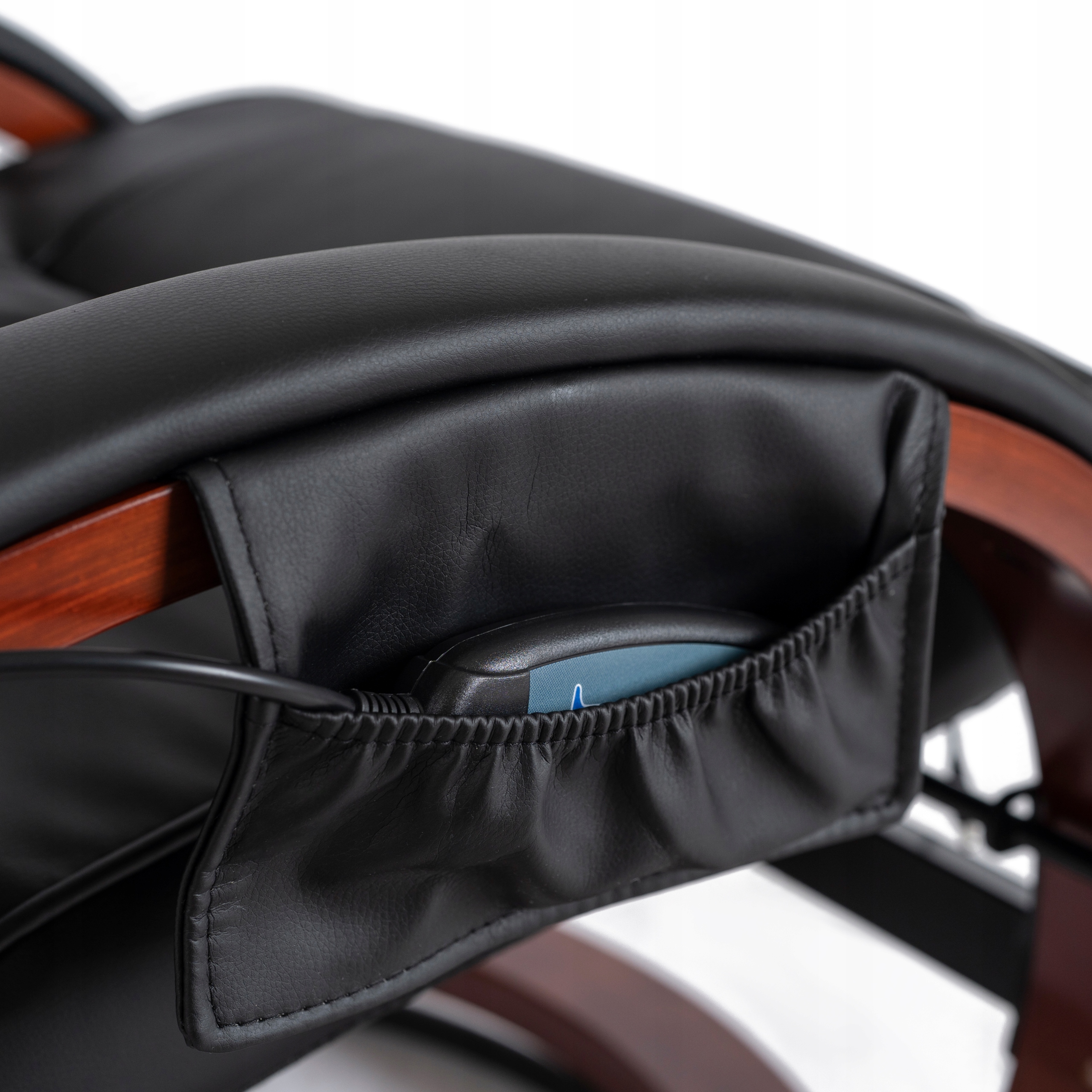 Dodatkowo pilot ma swoje stałe miejsce – poręczną boczną kieszeń, dzięki której zawsze jest pod ręką. To rozwiązanie sprawia, że korzystanie z fotela jest nie tylko komfortowe, ale też wyjątkowo wygodne na co dzień.