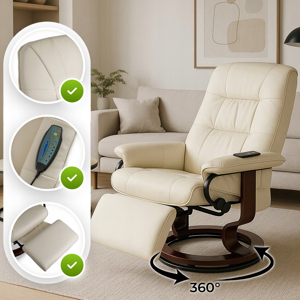 Fotel WEST w szlachetnym odcieniu beżu to połączenie elegancji i wygody. Tapicerka z miękkiej, ekoskóry otula ciało, a wbudowany system masażu z funkcją podgrzewania zamienia każdy moment w domowy relaks.