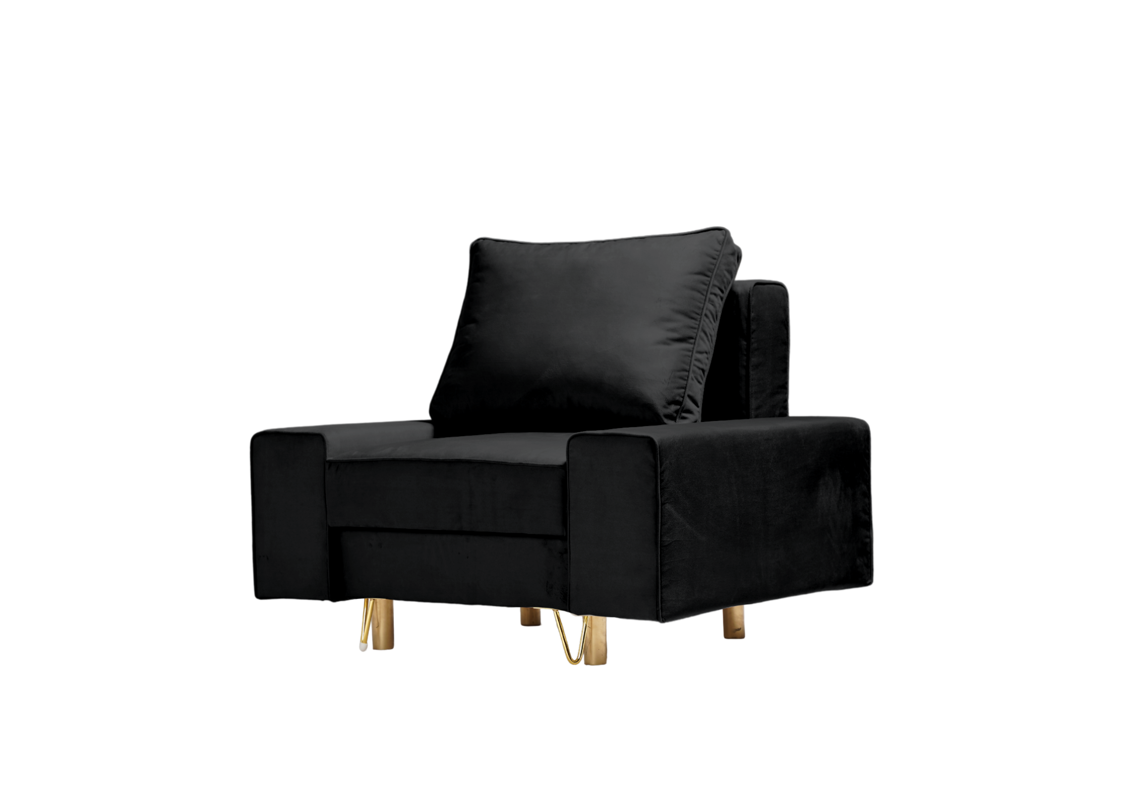 Tapicerowany Fotel z kolekcji STINO to fotel elegancki fotel na złotych metalowych nogach, który kryje pod siedziskiem pojemnik na drobiazgi. W kolekcji Stino dostępny jest również fotel rozkładany, sofa, pufa oraz narożnik.