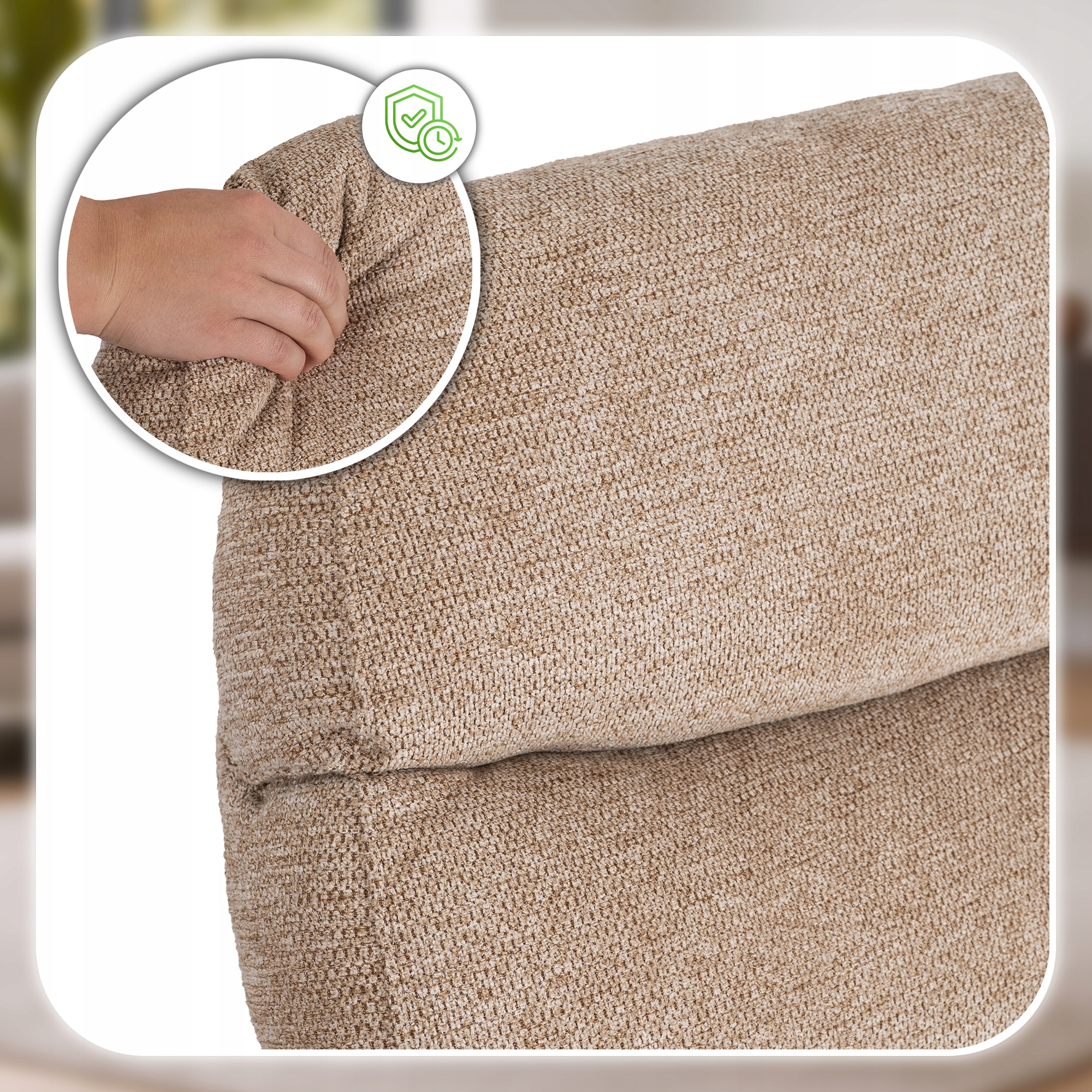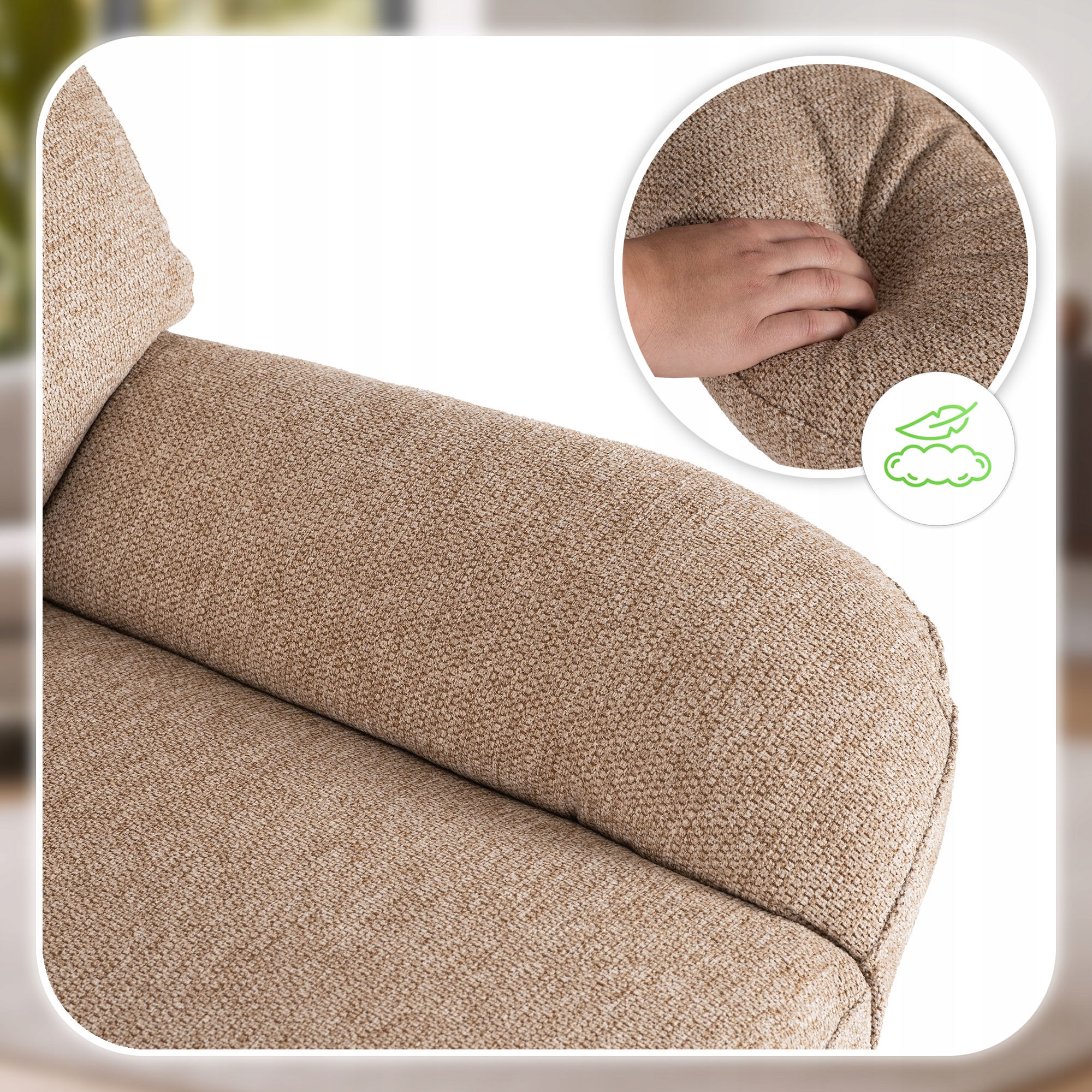 - Ekskluzywna tkanina obiciowa – miękka, przyjemna w dotyku, odporna na ścieranie.