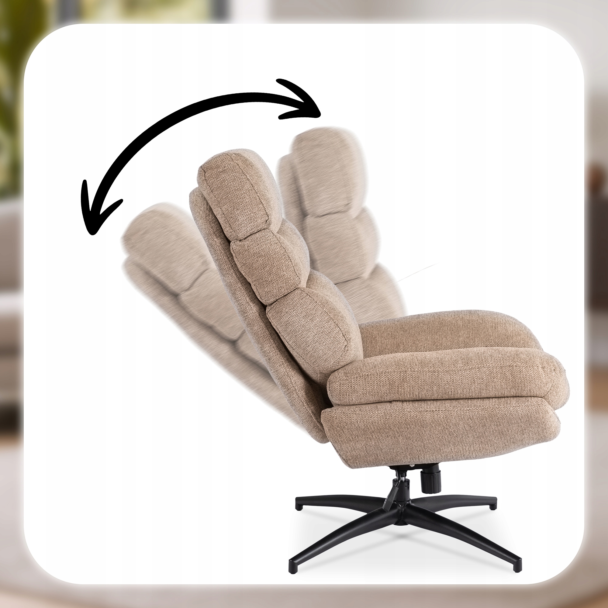 Fotel ASTURIA posiada funkcję bujania z możliwością blokady, dzięki czemu możesz swobodnie się zrelaksować lub zatrzymać oparcie w stabilnej pozycji. Dodatkowo, regulacja siły nacisku oparcia pozwala dostosować intensywność bujania do indywidualnych preferencji – od delikatnego kołysania po mocniejsze odchylenie.