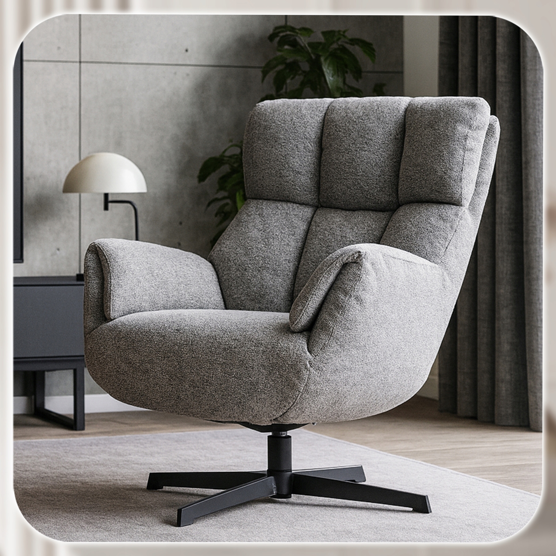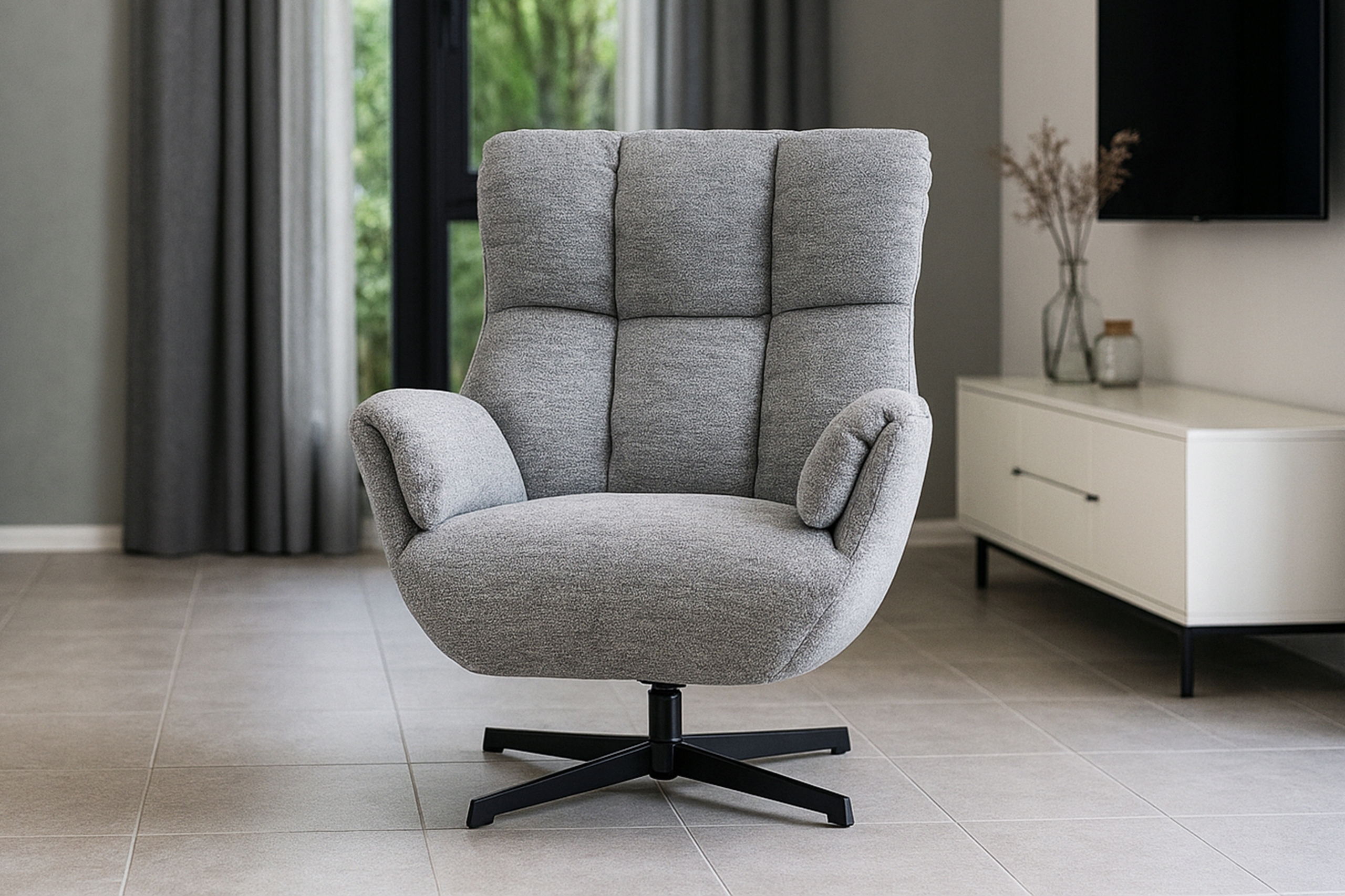 Nowoczesna forma, miękkie siedzisko i unikalne przeszycia sprawiają, że fotel przyciąga spojrzenia. Elegancka, szara tkanina pasuje do każdego wnętrza – od minimalistycznych aranżacji po luksusowe salony. Fotel REAL zapewnia relaks na najwyższym poziomie.