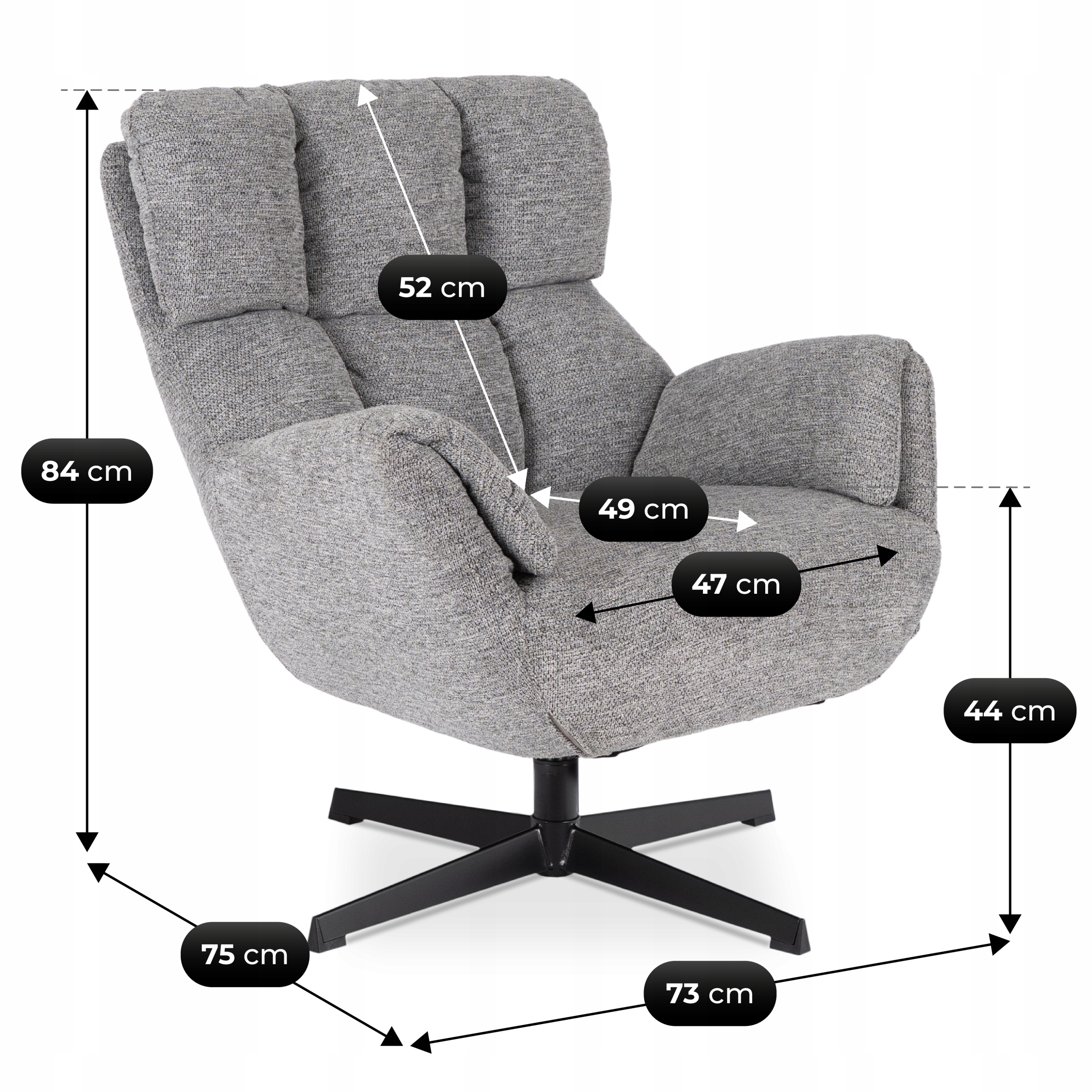- Szerokość fotela: 73 cm