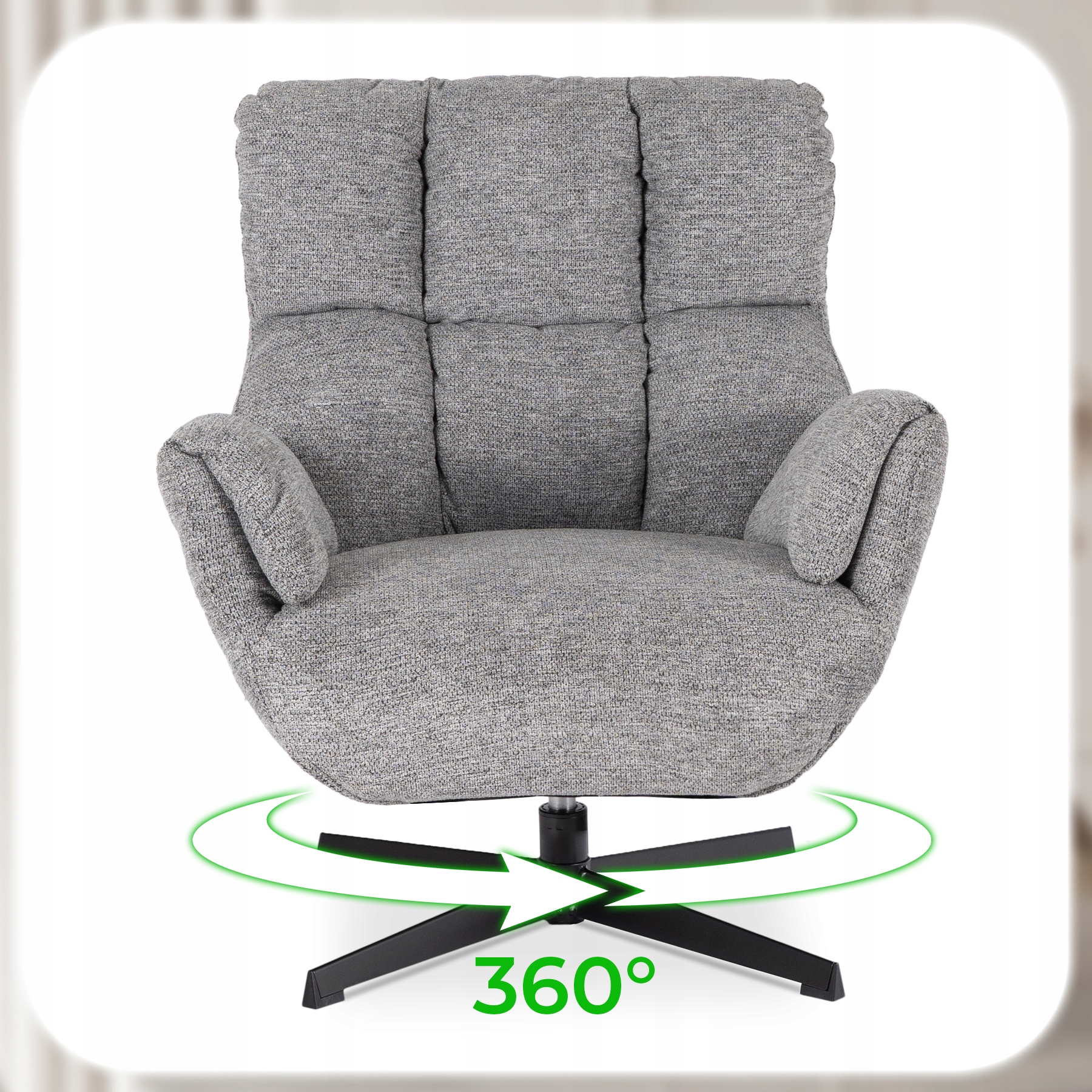 Fotel wyposażony jest w funkcję obrotu o 360°, co zapewnia pełną swobodę ruchu i wygodę w każdej sytuacji. Dzięki stabilnej podstawie i płynnemu mechanizmowi obrotowemu możesz łatwo zmieniać kierunek siedzenia, nie wstając z miejsca. Idealny do salonu, biura lub garderoby – tam, gdzie liczy się komfort i funkcjonalność.