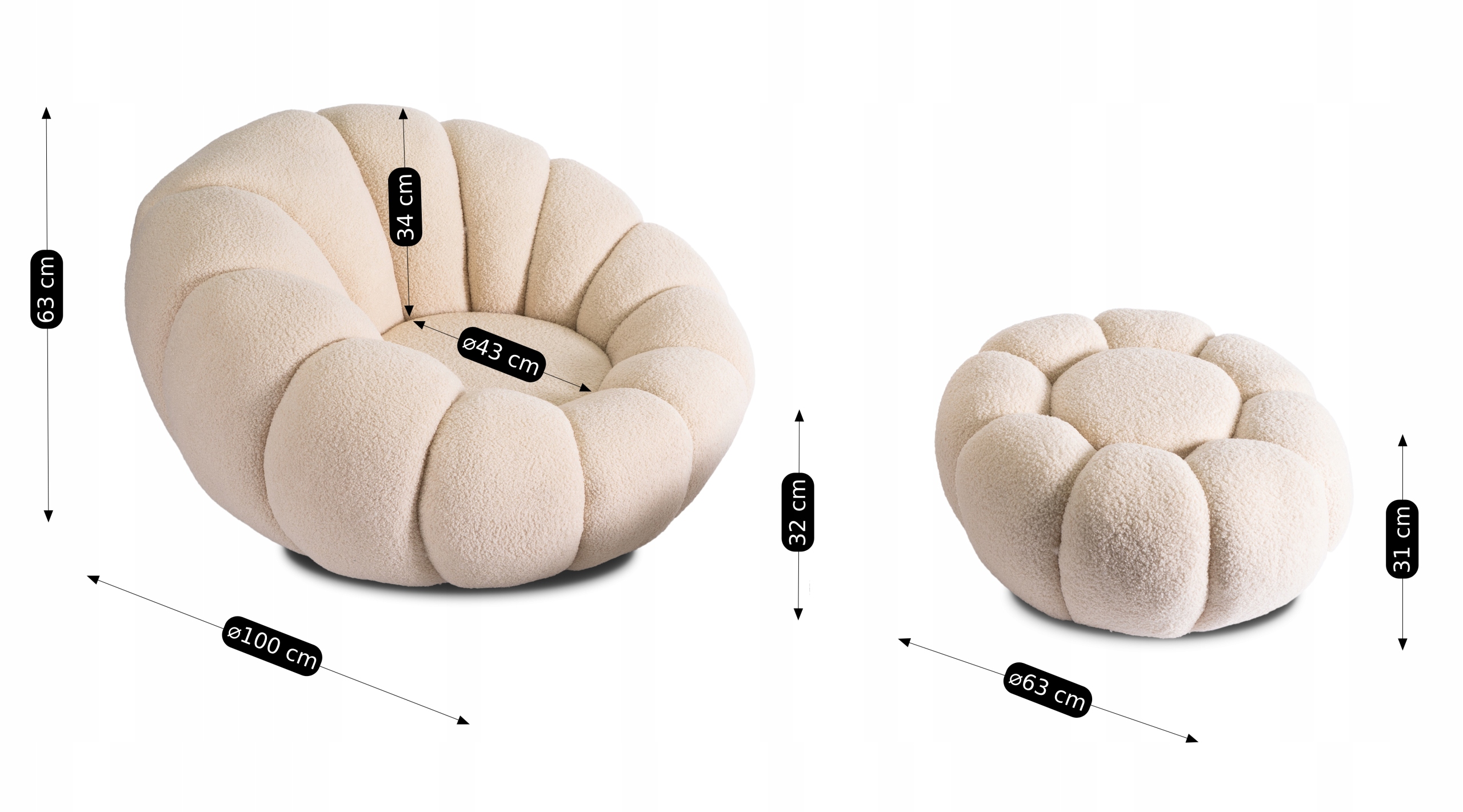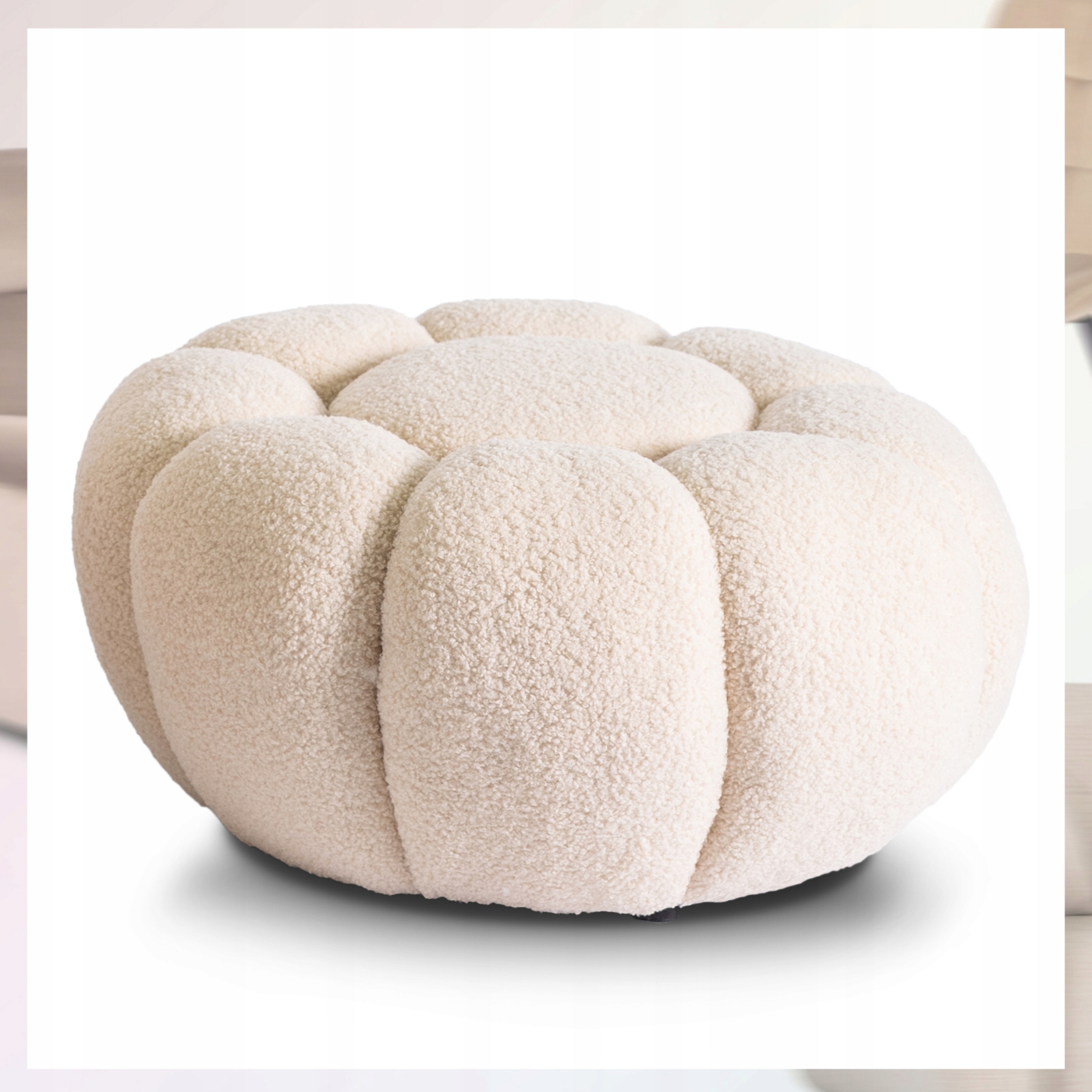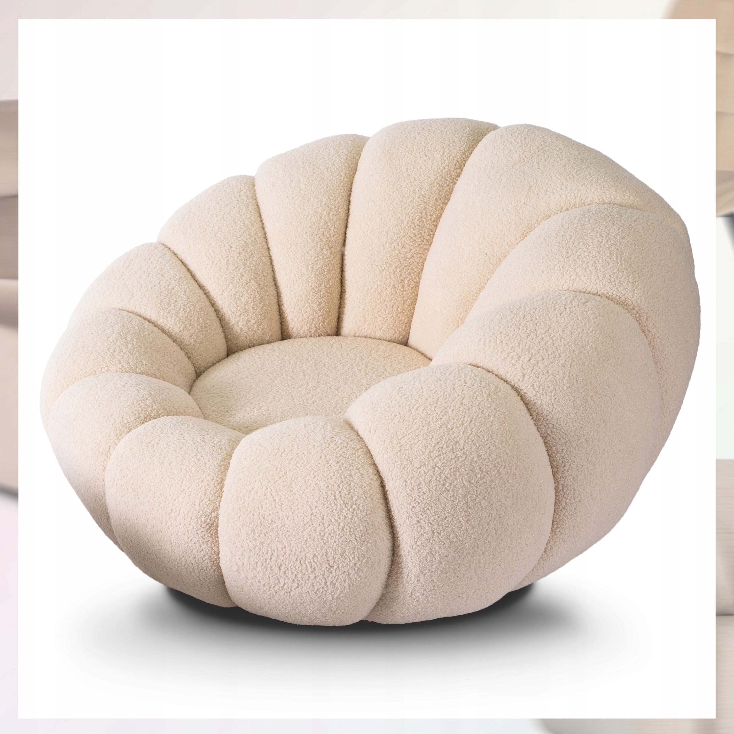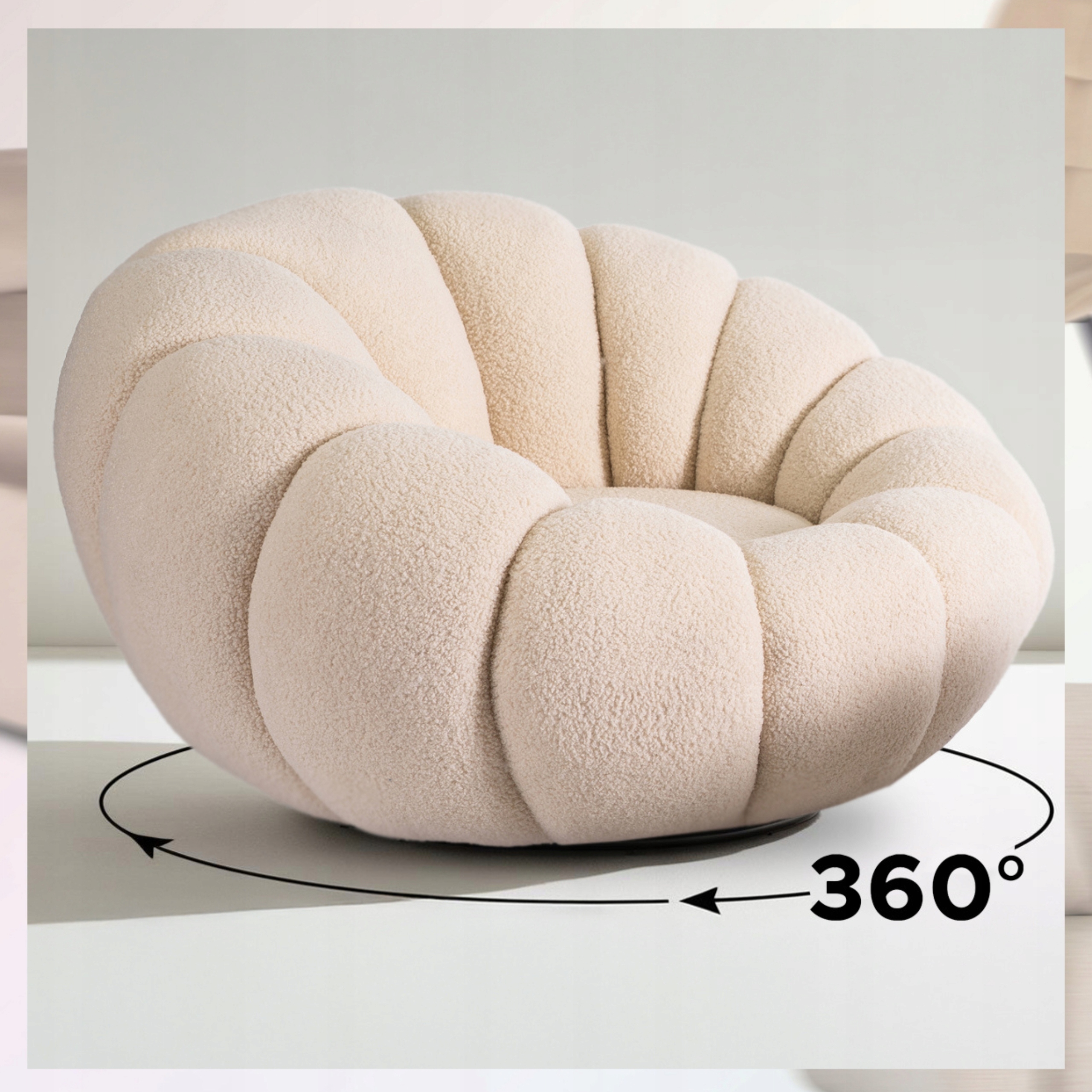⭐ Obrotowe siedzisko 360° zapewnia pełną swobodę ruchu, a pluszowa tapicerka boucle o strukturze „baranka” dodaje ciepła i stylowego wyglądu.