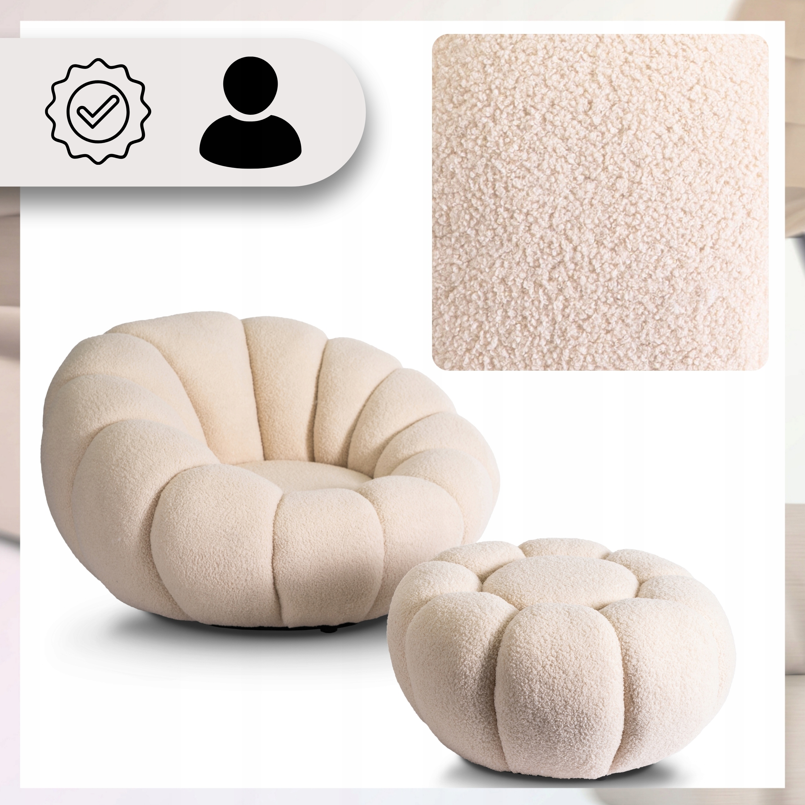 Fotel Obrotowy z Podnóżkiem Pufa Wypoczynkowy do Salonu Teddy PETTIT Beż ⭐⭐⭐⭐⭐