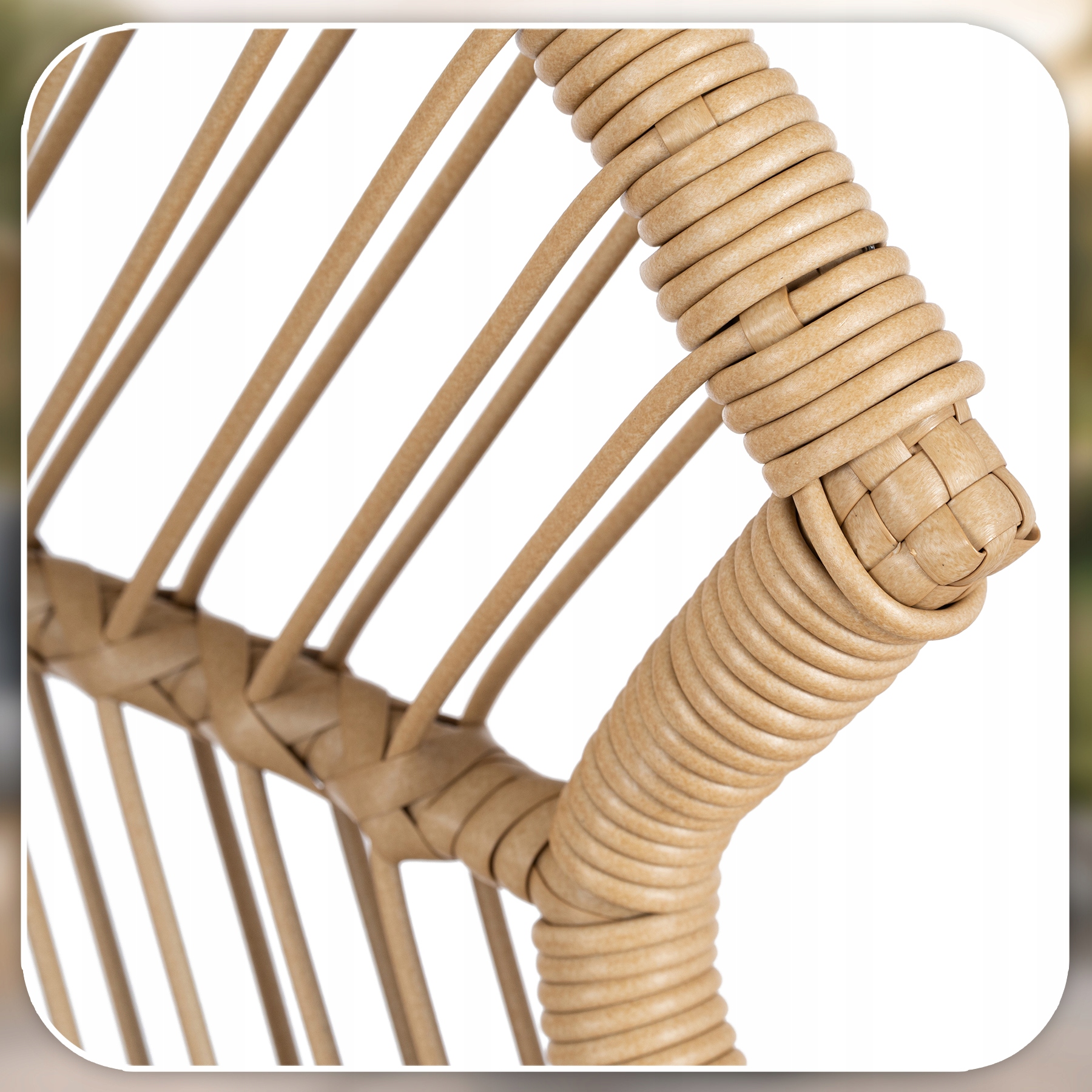 Fotel posiada solidną metalową konstrukcję, która zapewnia stabilność i odporność na codzienne użytkowanie. Całość została estetycznie wykończona plecionką, dzięki czemu fotel zyskuje lekki, naturalny wygląd i idealnie wpisuje się w modne aranżacje boho.