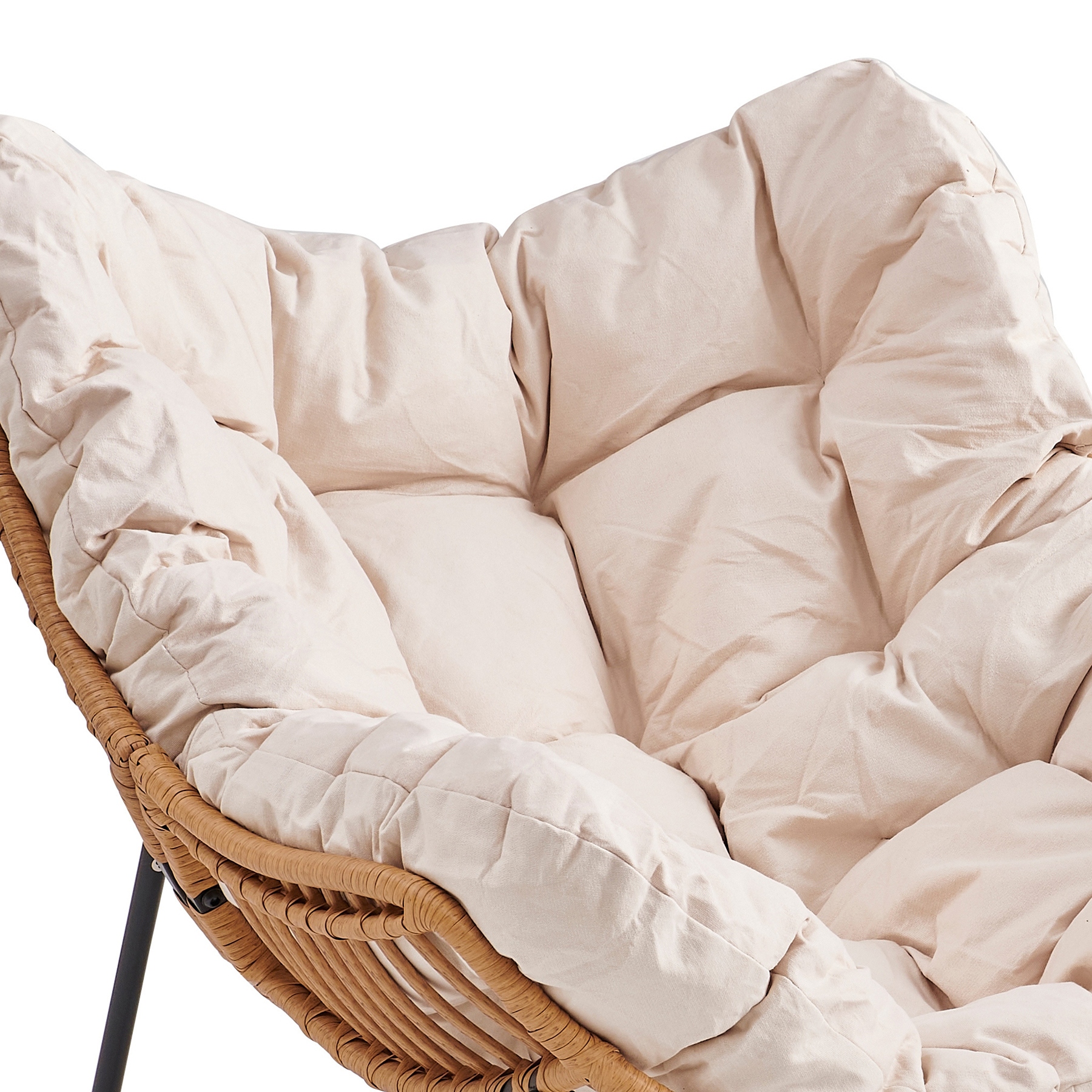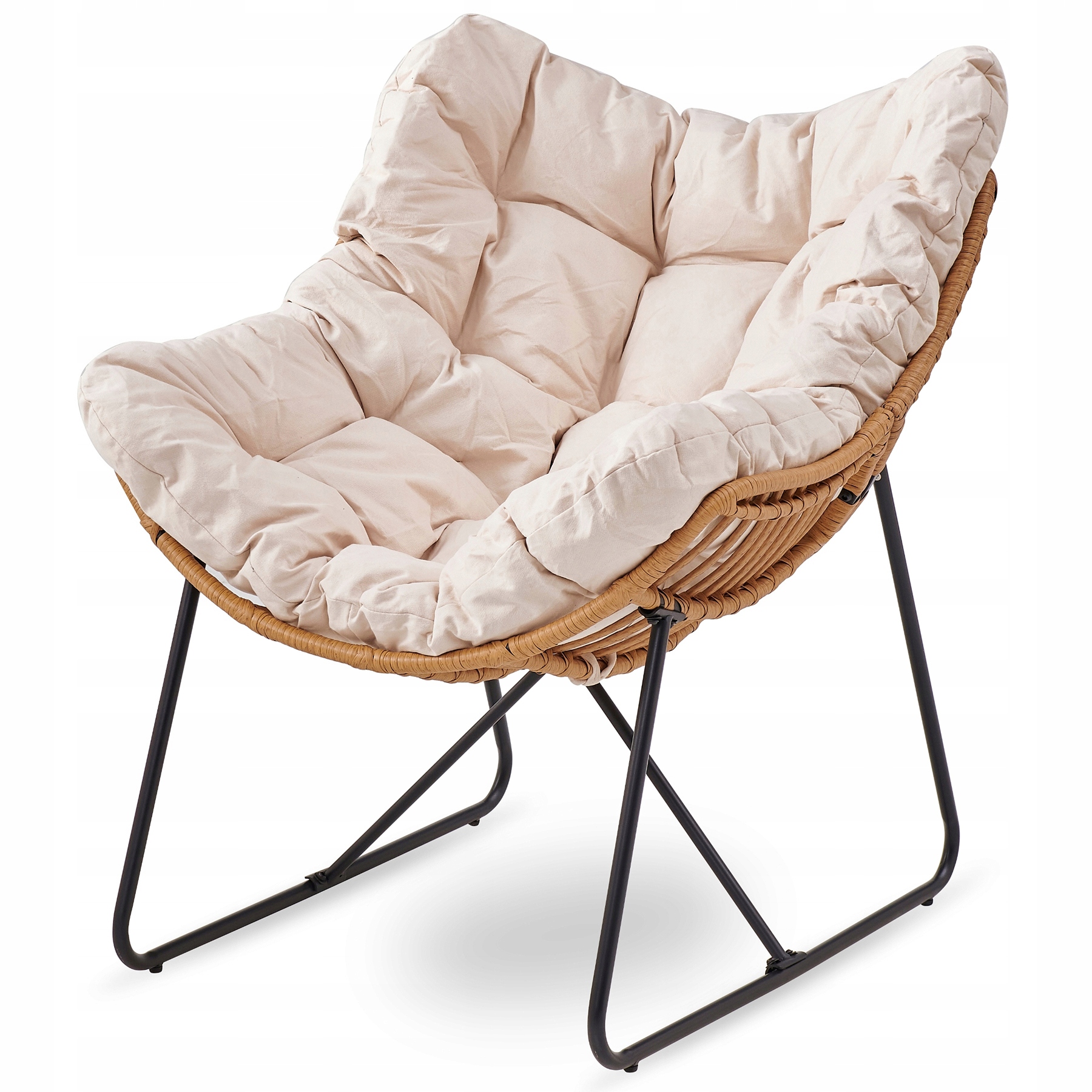 Siedzisko fotela wypełnia gruba, pikowana poduszka w jasnym, beżowym kolorze.
