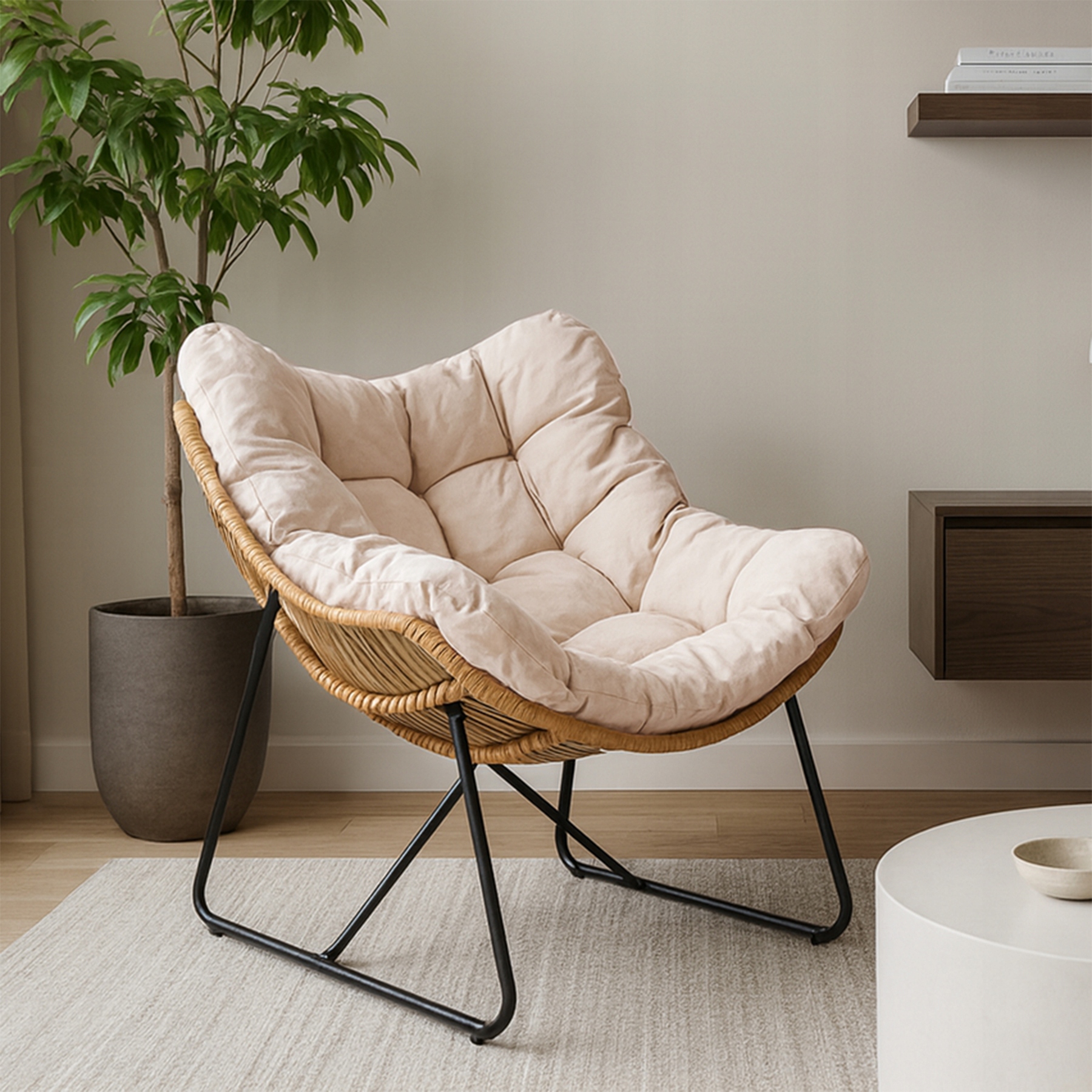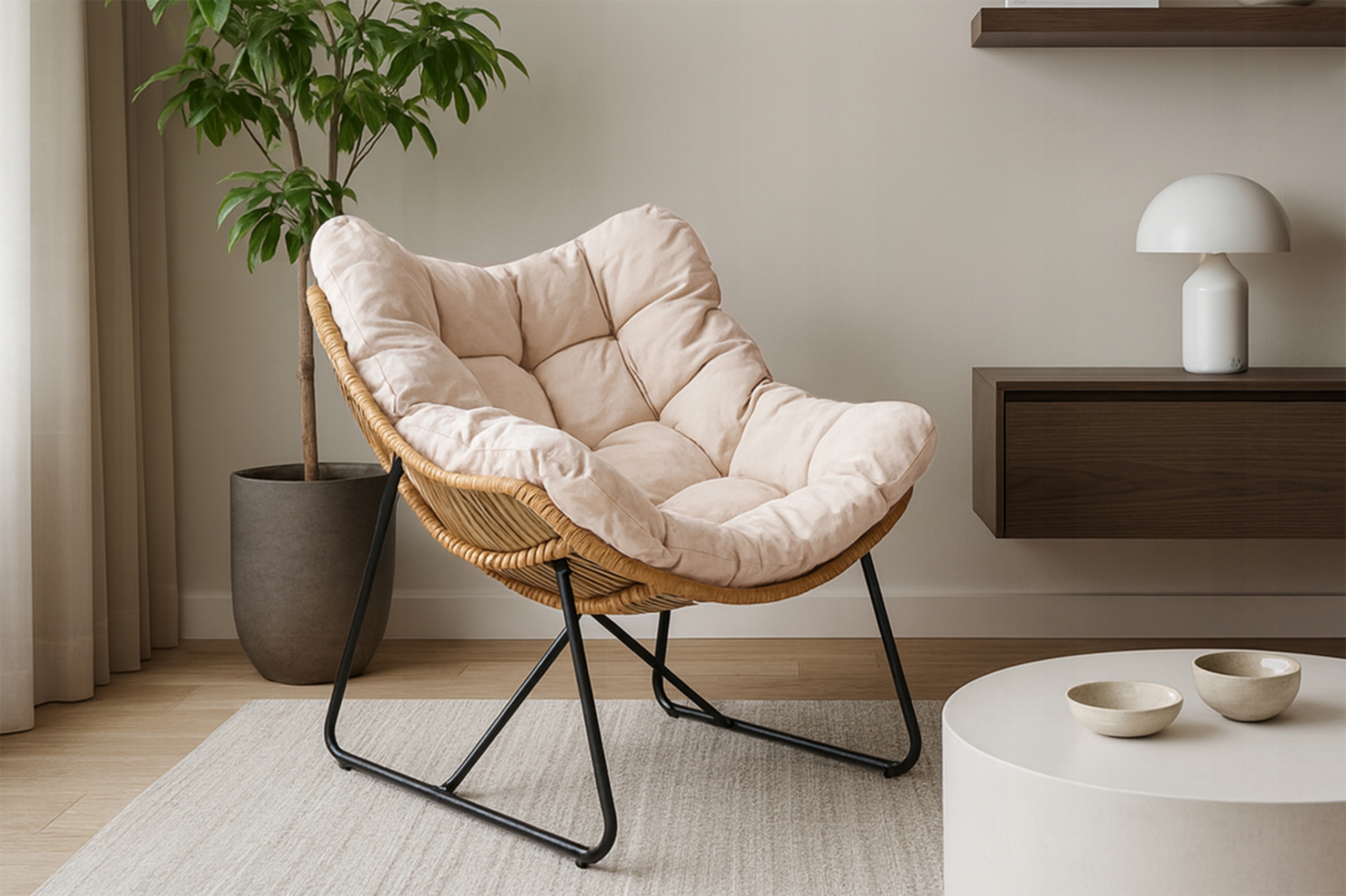 Fotel FIN to idealne miejsce na relaks - świetnie sprawdzi się w salonie. Jego konstrukcja opiera się na stabilnym, metalowym stelażu pokrytym plecionką, która dodaje mu ciepła i naturalnego wyglądu.
