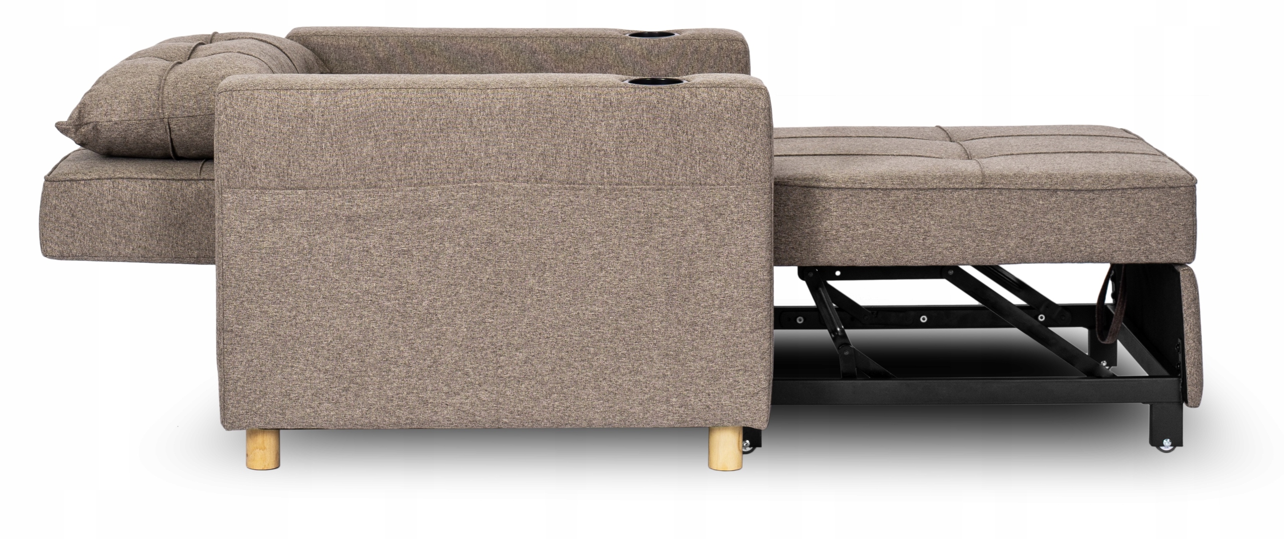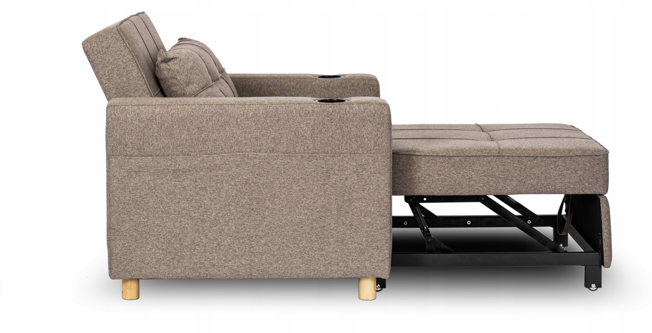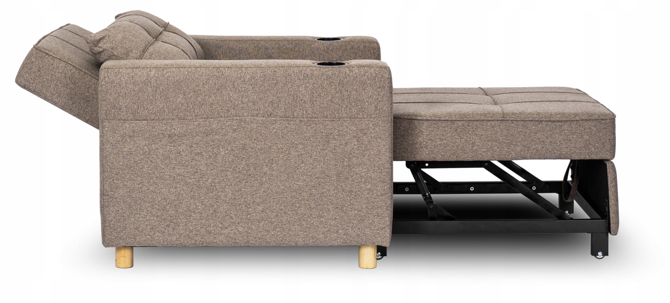 Fotel rozkłada się w podobny sposób, jak w przypadku wersalki. W celu wysunięcia podnóżka należy chwycić fotel od spodu i pociągnąć do siebie. Następnie za pomocą materiałowej rączki wysunąć górną część podnóżka. Oparcie odchyla się ręcznie (mechanizm jak w wersalce) w kilkustopniowej regulacji.